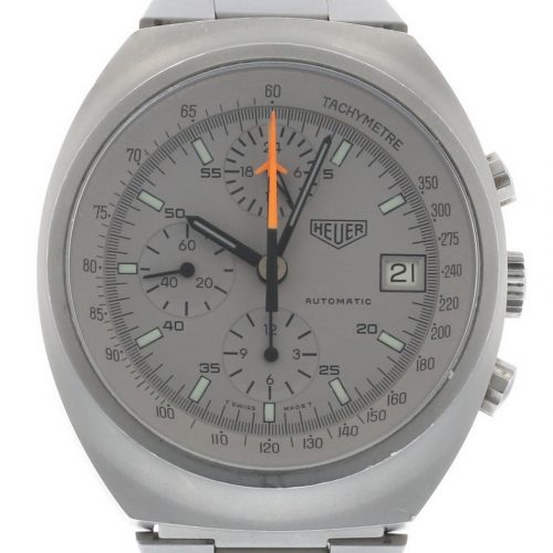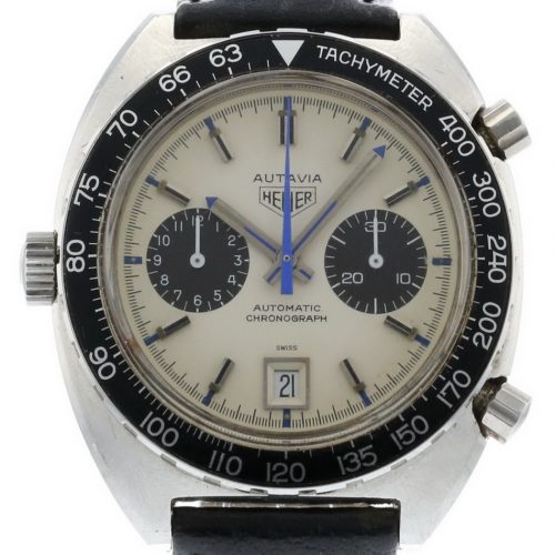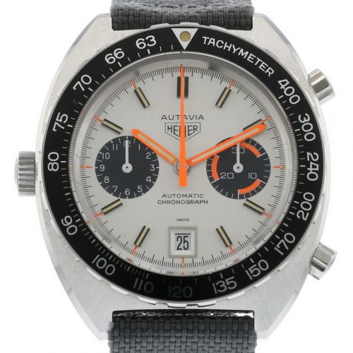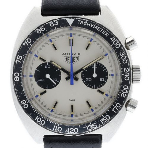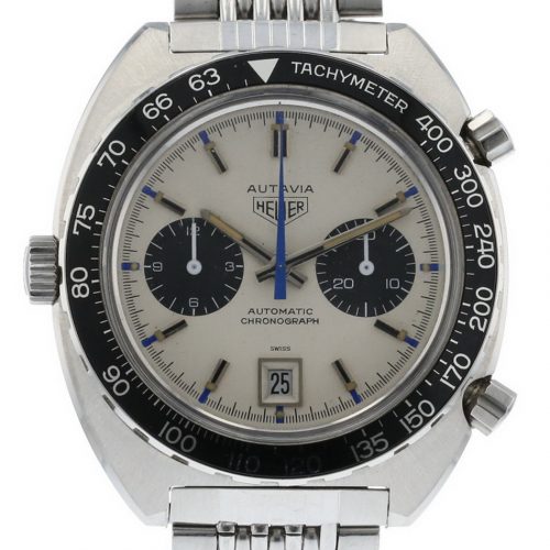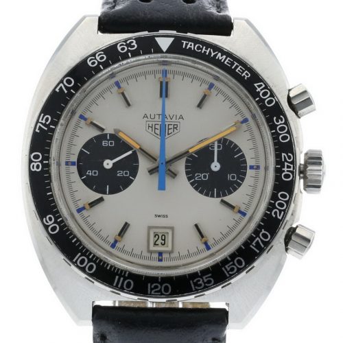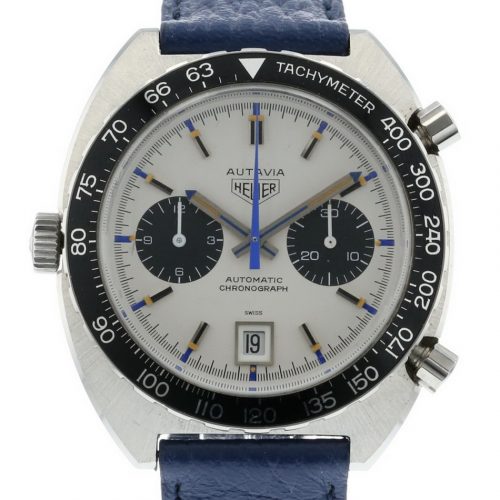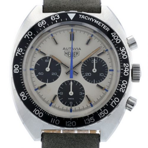 Heuer introduced its line-up of automatic chronograph in 1969, and the Autavia received not only its first automatic movement but also an entirely new color scheme. The black dials of the 1960s gave way to an entirely new look – white dials, black registers, blue accents and a rotating Tachymeter bezel. Swiss Formula One hero Jo Siffert wore this model, and the entire line-up of these white-dialed models are now known as the “Siffert” Autavias. Over the period from 1969 through the mid-1970s, Heuer produced at least six versions of the automatic “Sifferts”, with an array of manual-winding models to complete the line-up.
