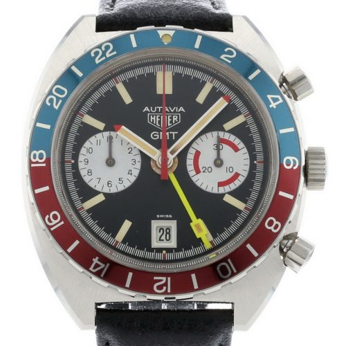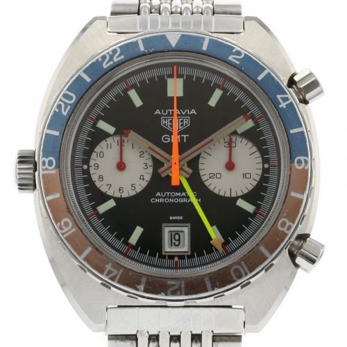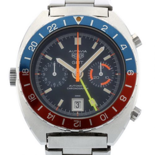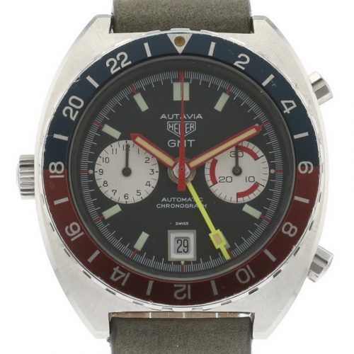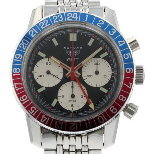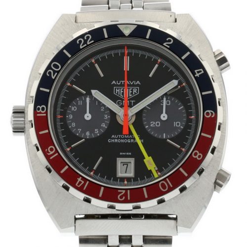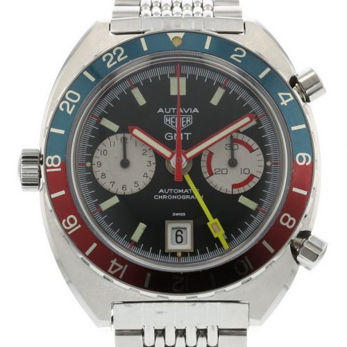 First introduced around 1968, the Autavia GMT chronographs combine a two or three register chronograph (in either case, with 12-hour capacity) with a colorful red and blue bezel that is rotated so that an additional hour hand will track the time in a second time zone. These GMT models resided in standard Autavia cases, however, the movements were modified to allow for the extra hand. Heuer marketed the Autavia GMT chronographs to pilots and travelers, producing almost a dozen models over the life of the Autavias.