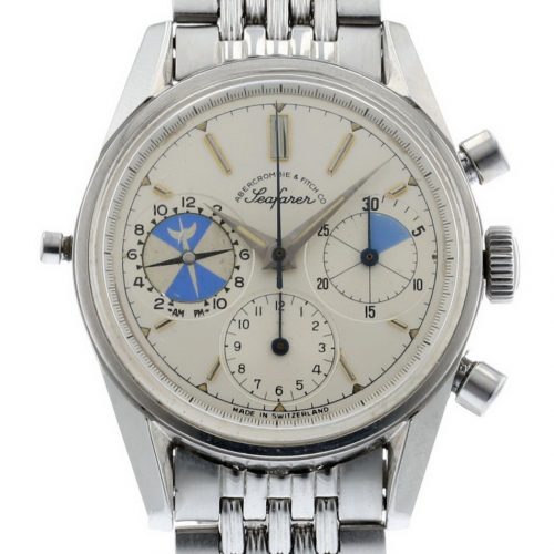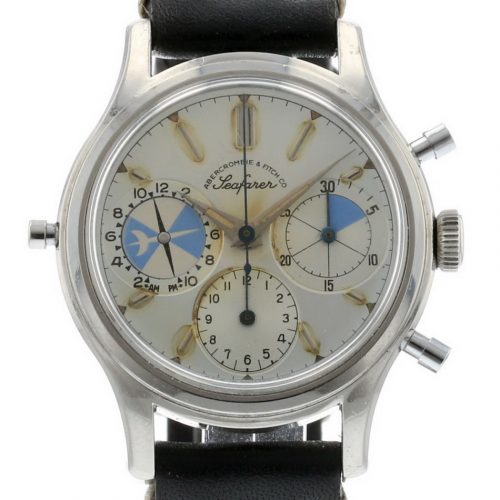Long before it became a chain of “mall stores” for teenagers, Abercrombie & Fitch was a very different style of retailer. The company had only two stores, in New York City and Chicago, and was the supplier of choice for well-heeled gentlemen embarking on adventures. Whether going on a climbing expedition, enjoying an ocean voyage, fly fishing, hunting or motoring, Abercrombie & Fitch offered top-quality gear for the most discerning customers. Beginning in the early 1950s, Abercrombie & Fitch had a unique relationship with Ed. Heuer & Co., calling on the watch company to design and build watches and chronographs to support its clients on their adventures. Heuer built rugged chronographs for Abercrombie & Fitch, and the most celebrated was the Seafarer, a unique watch that combined a 12-hour chronograph with a dial (at nine o’clock) to show the high and low tides each day. Abercrombie & Fitch sold these colorful chronographs under the Seafarer name, while Heuer sold them as “Mareographes” and also produced them for Orvis, these being sold under the “Solunagraph” model name. The Seafarers were always housed in cases used by other models of Heuer chronographs, including cases for Carreras and Autavias.