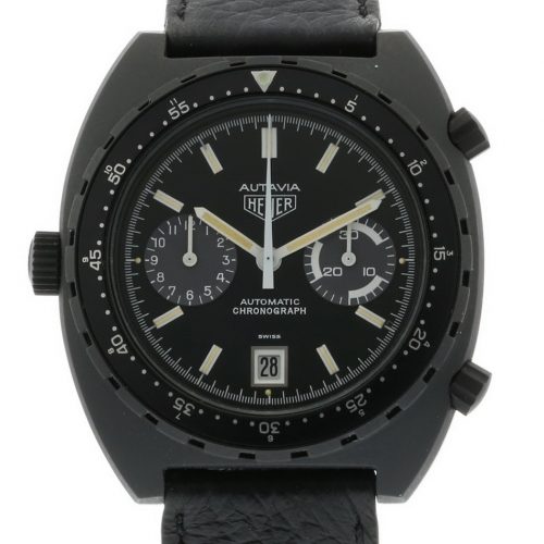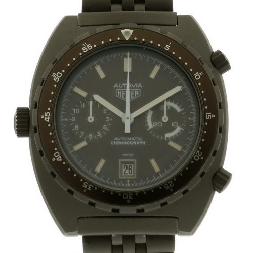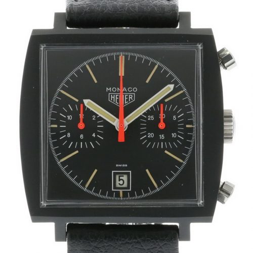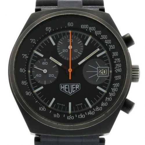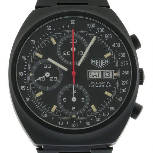 - Item 61 is one of the rarest of the vintage Heuer chronographs, a manual wind Monaco in a black PVD case. This was the last version of the Monaco produced by Heuer (circa 1975), in an attempt to boost sales through the use of the “military” look that was then becoming popular. This version of the Monaco never appeared in a Heuer catalog, and appears not to have gone into full production, but they are coveted by today’s collectors.