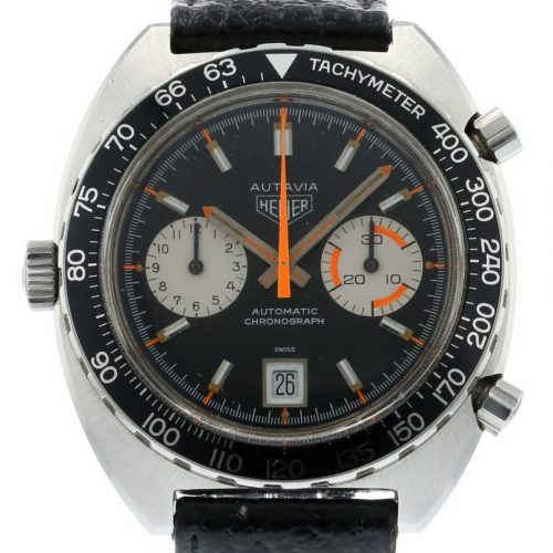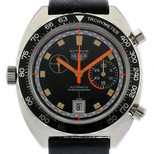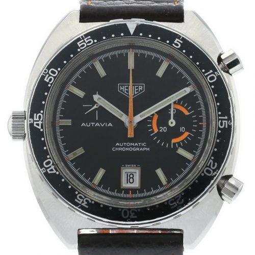 - Item 89 shows an entirely new look that Heuer offered for the Autavia, in 1972. The Reference 11630 case is deeper than the previous 1163case, and accommodates a mineral crystal in place of the previous plastic. The color scheme is also new — a metallic, brushed silver dial, black registers, and orange accents on dial and hands.