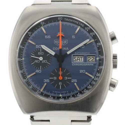 In addition to its “big three” line-up of automatic chronographs (Autavia, Carrera and Monaco), Heuer offered a dazzling variety of colorful automatic chronographs throughout the 1970s. The shapes and sizes reflected the funk of the “Me Decade”, as Heuer created chronographs to suit every taste (or for people with no taste at all)!!