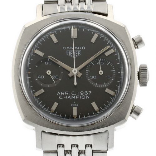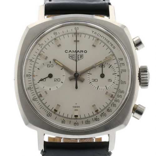 The vintage Heuer enthusiasts sometimes refer to the “Big Three” of Heuer’s chronographs – the Autavia, Carrera, and Monaco – but recently the Camaro has moved to the top of the list of hot Heuers. The Camaro was introduced in 1967, being named for the Chevrolet sports car then enjoying great popularity in the United States. Indeed, the Camaro was the pace car for the Indianapolis 500 in 1967 and 1969. Over the next few years, Heuer produced almost 50 different versions of the Camaro, all using the same cushion-shaped case and all being powered by manual-wind Valjoux movements. The Camaros provide a nice transition between the classic models from the early 1960s (Autavia and Carrera) to the wilder models that Heuer would introduce in the 1970s (Monaco, Silverstone, and Montreal, for example).