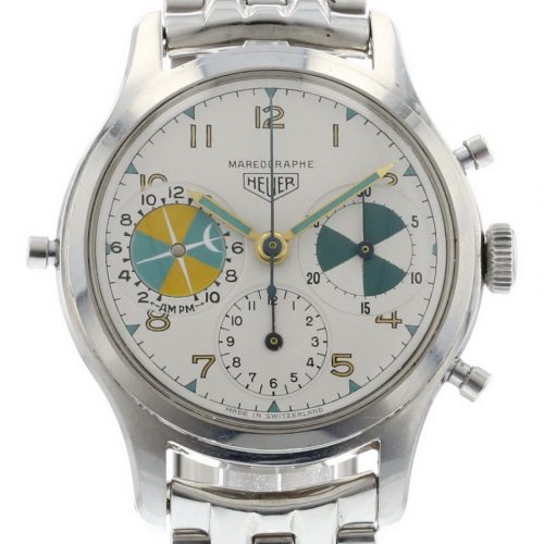 - Item 75 is the earliest of the four, a Heuer Mareographe housed in a Reference 2444 chronograph case. The green of the hands is a perfect match to theunique yellow and green of the registers. The community of collectors has probably seen fewer than five of this model.