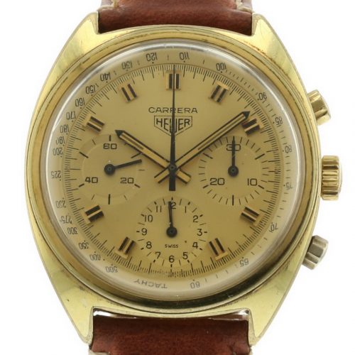 - Item 5 is a Reference 73655 Carrera with a gold-plated case and a champagne dial and inner bezel. This is the second execution of this model, and has the“double-wide” markers on the dial. The hands have black edges, with brushed gold and luminous inserts.