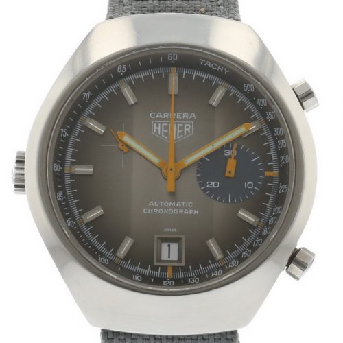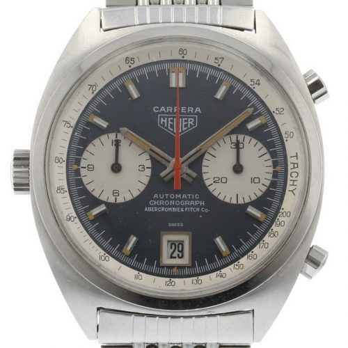 - Item 73 is a Reference 1153 N Carrera, one of the earliest versions of the automatic Carrera, with a charcoal gray dial, and white for the registersand inner bezel. The polished steel hands mark this as an early execution of the automatic Carrera. This Carrera was made by Heuer for Abercrombie & Fitch, as shown by the logo across the bottom of the dial.