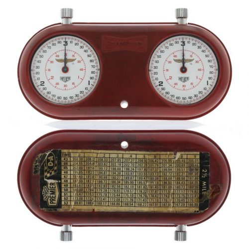 - Item 86 captures the essence of the Heuer brand. This pair of matching stopwatches indicates the time to 1/100 of a second, with the crown performing threefunctions – start, stop and reset. The red rubber holder was issued by Champion, a brand long associated with motorsports and Heuer, and the sticker on the back converts the elapsed time at the Indianapolis Motor Speedway into miles per hour. While the provenance of this pair of stopwatches is not known, we can safely assume that these stopwatches timed some laps of the Indianapolis 500, in the mid-1960s.