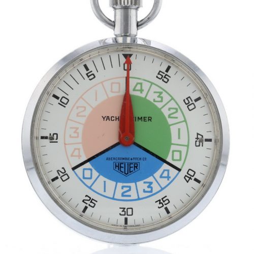 - Item 93 is a colorful Yacht Timer, made by Heuer for Abercrombie & Fitch. This is a 15-minute countdown timer, allowing the yacht racer to time theapproach to the start line, with the three five-minute sections of the dial corresponding to the horns sounded before the beginning of the race. This stopwatches also brings together three aspects of Heuer’s history — its dominance in stopwatches for sports, the brand’s collaboration with Abercrombie & Fitch, and its connection to yacht racing and other water sports.