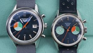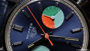 One element of the Hodinkee Limited Edition Skipper created considerable discussion in the vintage Heuer collectors community — the use of a conventional 30-minute recorder rather than a 15-minute countdown timer. Traditionalists contended that the 15-minute countdown function was the defining feature of a Skipper chronograph.