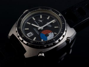 Patented in 1964, the Aquastar Regate used five disappearing red balls to count down to the start of a yacht race. When the pusher is pressed, the five red balls appear, and the second hand flies back to zero and starts running. After five minutes, the red balls have turned to silver, “disappearing” as they match the silver of the dial.