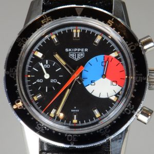 Heuer marked Intrepid’s victory with the creation of an entirely new chronograph model – the Skipper. Derived from the two register Carreras of the day, the new Skipper (Reference 7754) featured a metallic blue dial, with a light green register for running seconds.