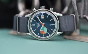As on the Hodinkee version of the Skipper (and all the vintage Heuer Skippers), the chronograph minute recorder is divided into three pie-shaped areas, each a different shade of blue.