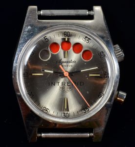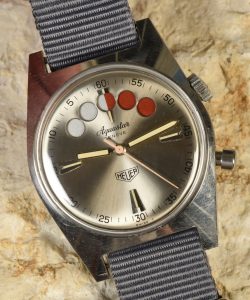 The version of the Regate produced for Heuer had “Aquastar Geneve” across the top of the dial, with the Heuer shield across the bottom. Soon, Heuer would offer its own series of Regatta models, using the “disappearing balls” display, with these models remaining in the catalog into the mid-1980s.