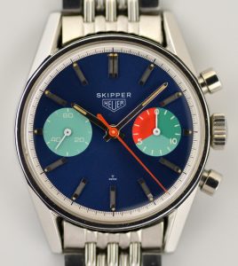 The colors for the dial and bezel returned to the original deep blue of the first Skipper, with the red, white and blue continuing for the countdown recorder. The time-of-day hands were a vibrant orange, also consistent with the orange accent of the chronograph hand on the first Skipper. A date was added at six o’clock, a feature of all future Skipper models. The bezel was marked in minutes and hours (MH), counting up in the style of the Autavia, rather than down in the style of classic yacht timers.