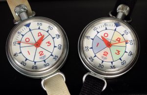 — With the layout of a conventional stopwatch, the small, circular minute recorder counts down the minutes from 5, 10 or 15, corresponding to the horns sounded by race officials. The outer scale counts down the seconds, with markings from 55 to zero.
