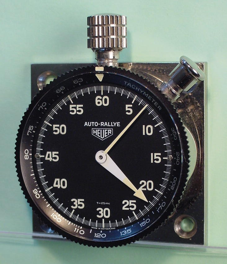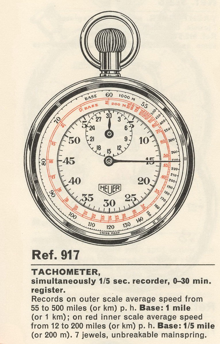 The most elegant solution to timing (and computing speeds over) a series of measured miles will be to use three stopwatches on a multi-sequence timing board (sometimes called a “lap timer”), as shown below. Each stopwatch has a three-function crown, that starts, stops and resets the timer with consecutive pushes. Using the three stopwatches mounted on this timing board, as one timer is stopped, the second timer is started, and the third timer is reset to zero. So as you go from one mile to the next to the next, you will always have one stopwatch stopped on your elapsed time for the previous mile, one stopwatch showing your running time for the current mile, and one stopwatch resting at zero, ready to start timing the next mile. Each push of the lever across the top of the crowns operates the start / stop / reset for all three stopwatches. If these stopwatches have a tachymeter scale on the dial (as on Heuer’s Reference 917 stopwatch, shown below), you are all set . . . you can drive the 150 miles from Atlanta to Birmingham, and the three watches will give you the exact time (and MPH) for each of the 150 miles.