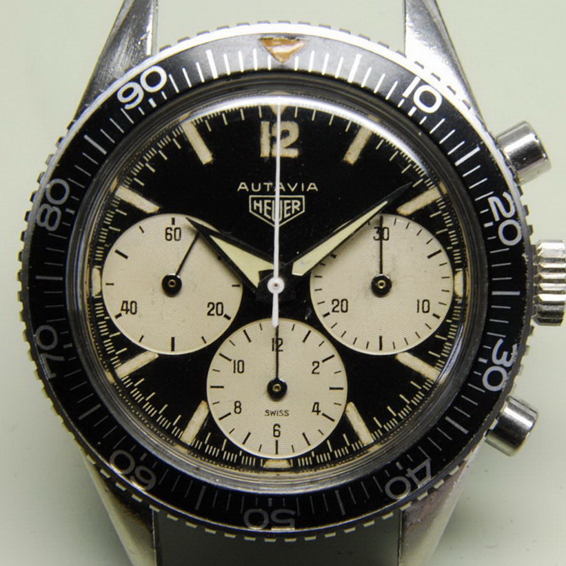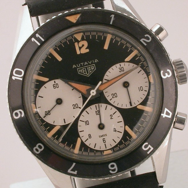 My theory as to why Heuer incorporated a rotating bezel into the Autavia chronographs suggests that through the years of supplying timing equipment to the racers and motorsports crowd — including the stopwatches, dashboard timers, timing boards and other equipment — Heuer realized the value of the rotating bezel. Even in its simplest form, with nothing more than a rotating triangle, the rotating bezel could be a useful tool. So it was to be expected that when Heuer introduced its Autavia chronograph in 1962, a chronograph designed for AUTomotive timing, the AUTavia included a rotating bezel. On the first series of Autavias, Heuer used hour and minute scales on the bezels. Both these scales supplemented the chronograph as a timing device. The rotating hour bezel could be set for a second time zone, making the Autavia a simple GMT chronograph. Next, Heuer added a decimal minutes bezel, meeting a particular need of rally timing (in which times are satted in hundredths of minutes rather than seconds.)