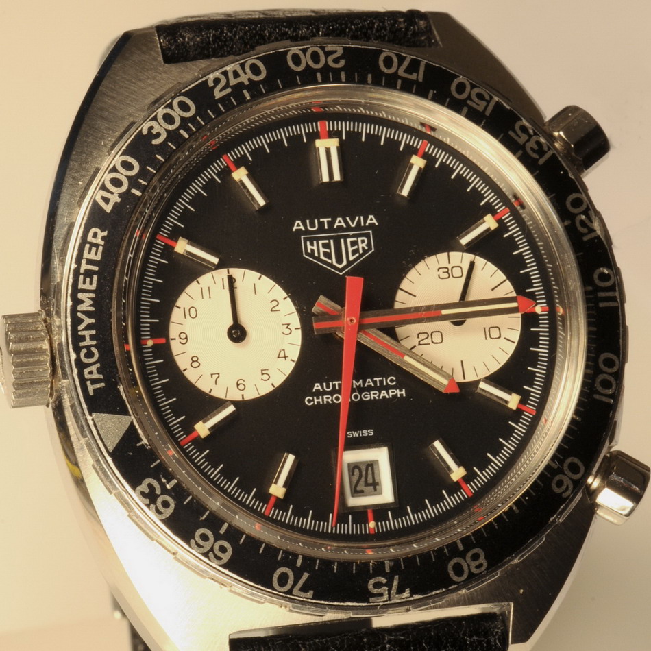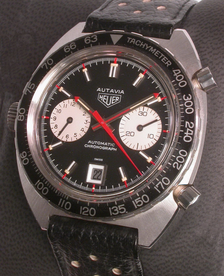 With Heuer’s introduction of the second execution of the Autavia case, in around 1967, Heuer introduced the first chronograph with a rotating tachymeter bezel (shown below). This rotating tachymeter bezel would become a hallmark of the Autavias, being used on various models of into the early 1980s.