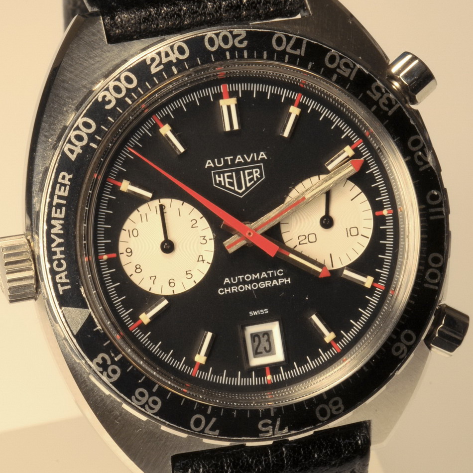 The Autavia was more than the racer’s favorite chronograph, however. In the 1960s and 1970s, the Heuer Autavia became the race fan’s favorite chronograph. In the early days of stock car racing — with the competition between Ford, Mercury, Chevrolet, Pontiac, Dodge and Chrysler — the automobile manufacturers lived by the slogan, “Win on Sunday, Sell on Monday”. Indeed, studies showed that the cars that won the races on Sunday also won in the dealer showrooms on Monday. So too, in the days before paid ambassadors, the watch brands realized that racing enthusiasts wanted to wear the same watches as the racers, and they wanted the look of racing. This racing look was embodied by the tachymeter bezel. While the iconic Rolex Daytonas and Omega Speedmasters offered “the look” with their fixed bezels, the Heuer Autavia offered this look, but with something more. With the rotating tachymeter bezel, Heuer improved the functionality of the Autavia, as a timekeeping device. The tachymeter bezel gave enthusiasts the “look” of racing; allowing the bezel to rotate gave them a useful tool to time measured miles, a second time zone, or when to add coins to the parking meter or take the brownies out of the oven!