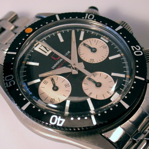 It is interesting to consider why, back in 1962, Heuer designed its Autavia with a rotating bezel, whereas Rolex, Omega and Breitling were more likely to leave the bezels on their chronographs “fixed” in place. Omega used rotating bezels on some of its watches, but not on its chronographs. So too, Rolex was a pioneer of the rotating bezel, with its Turn-O-Graphs and Submariners, but Rolex never used a rotating bezel on its chronographs. We see brands like Brietling (with its Navitimers, Unitimes and Co-Pilots) and Universal Geneve (with the Compax series) that used rotating bezels on chronographs, but — as shown by the pair of Universal Geneve Compax chronographs (below) — it was only the minutes and hours bezels that rotated.