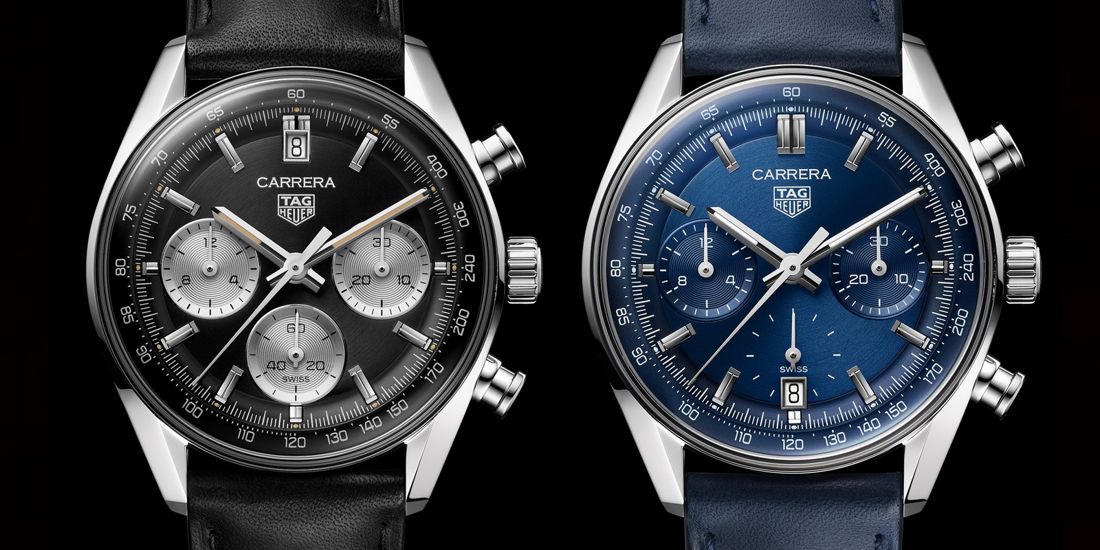 The two 42 millimeter chronographs introduced today — one with a blue dial and one with a black dial — continue the racing motif always associated with the Carrera chronographs.