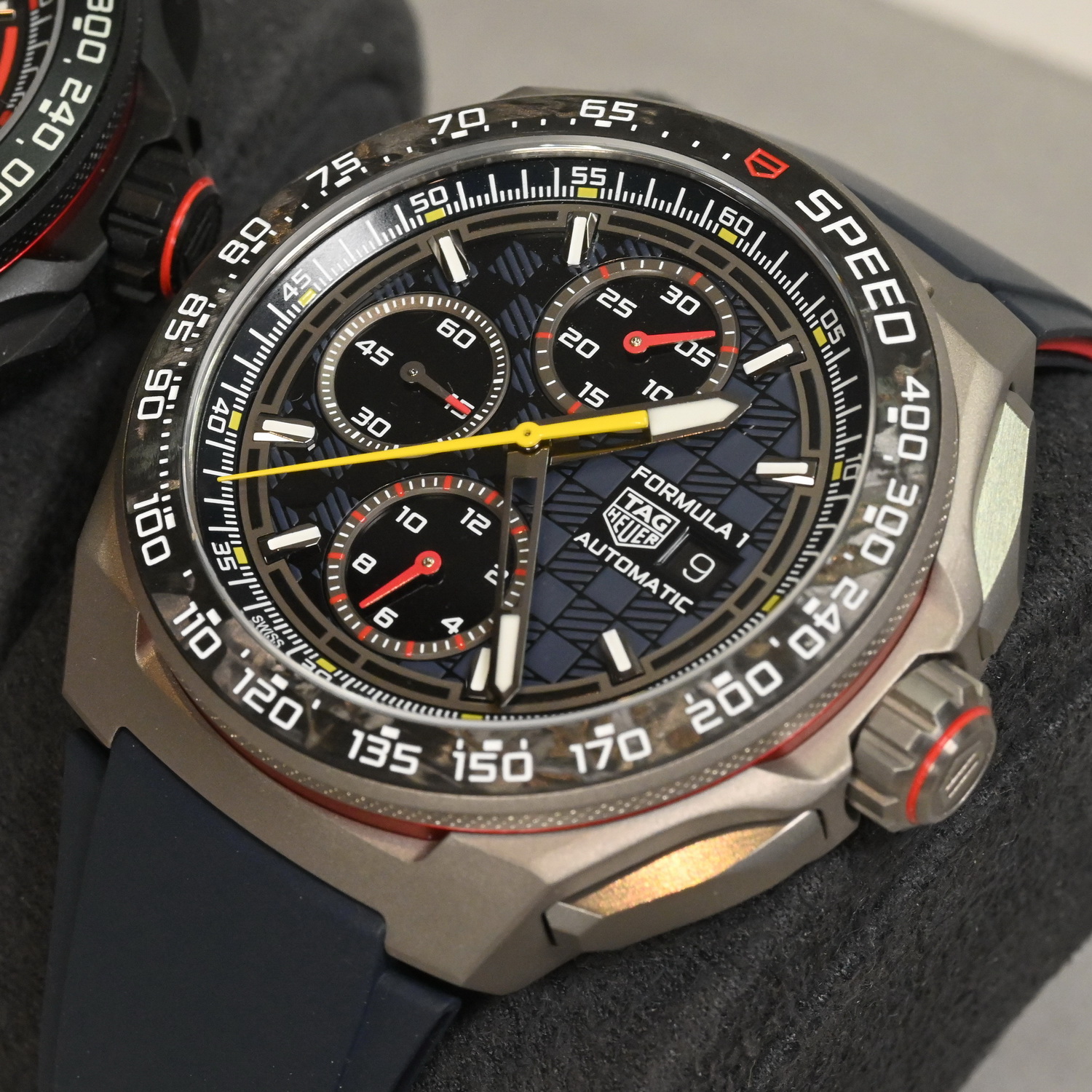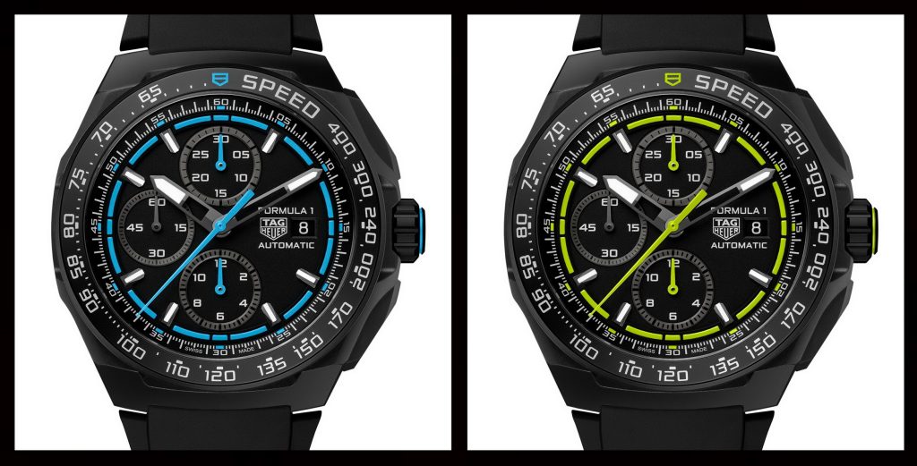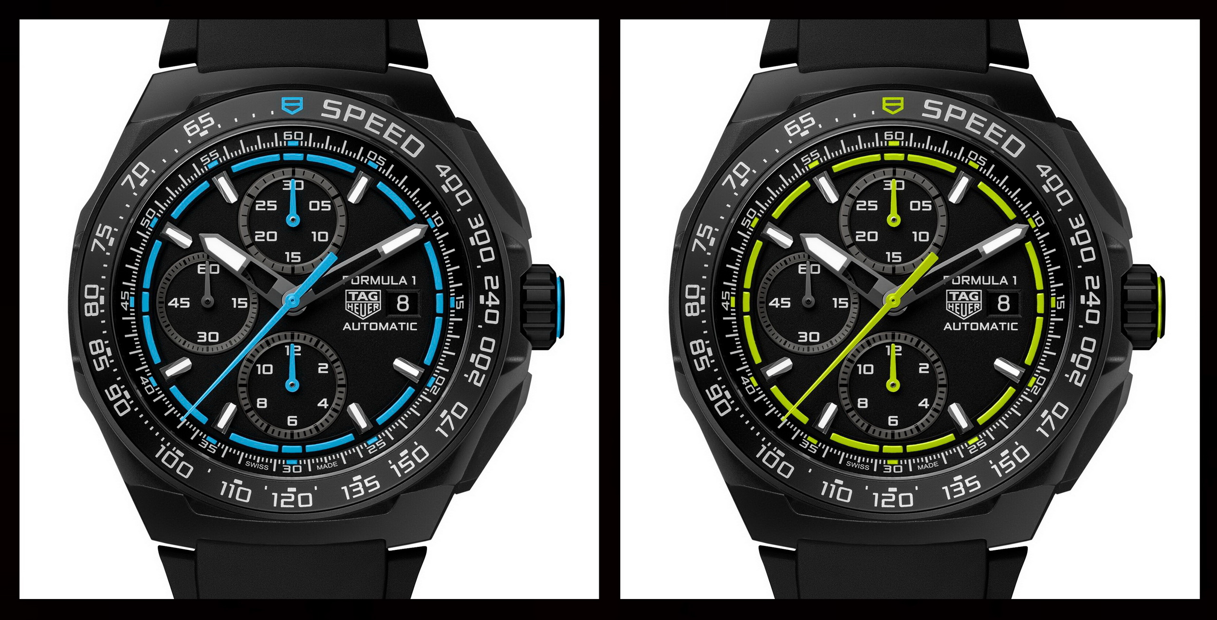 Here are descriptions of the two new Formula 1 chronographs that will be available in the Spring of 2024, with the “Blue” track model coming in March 2025 and the “Lime” track model coming in June 2025.