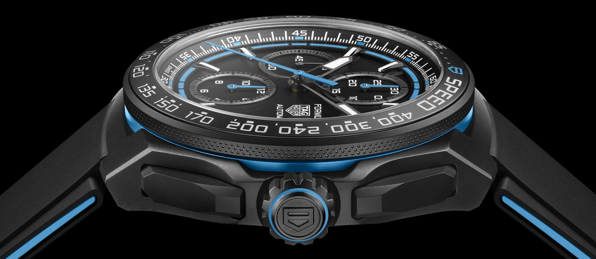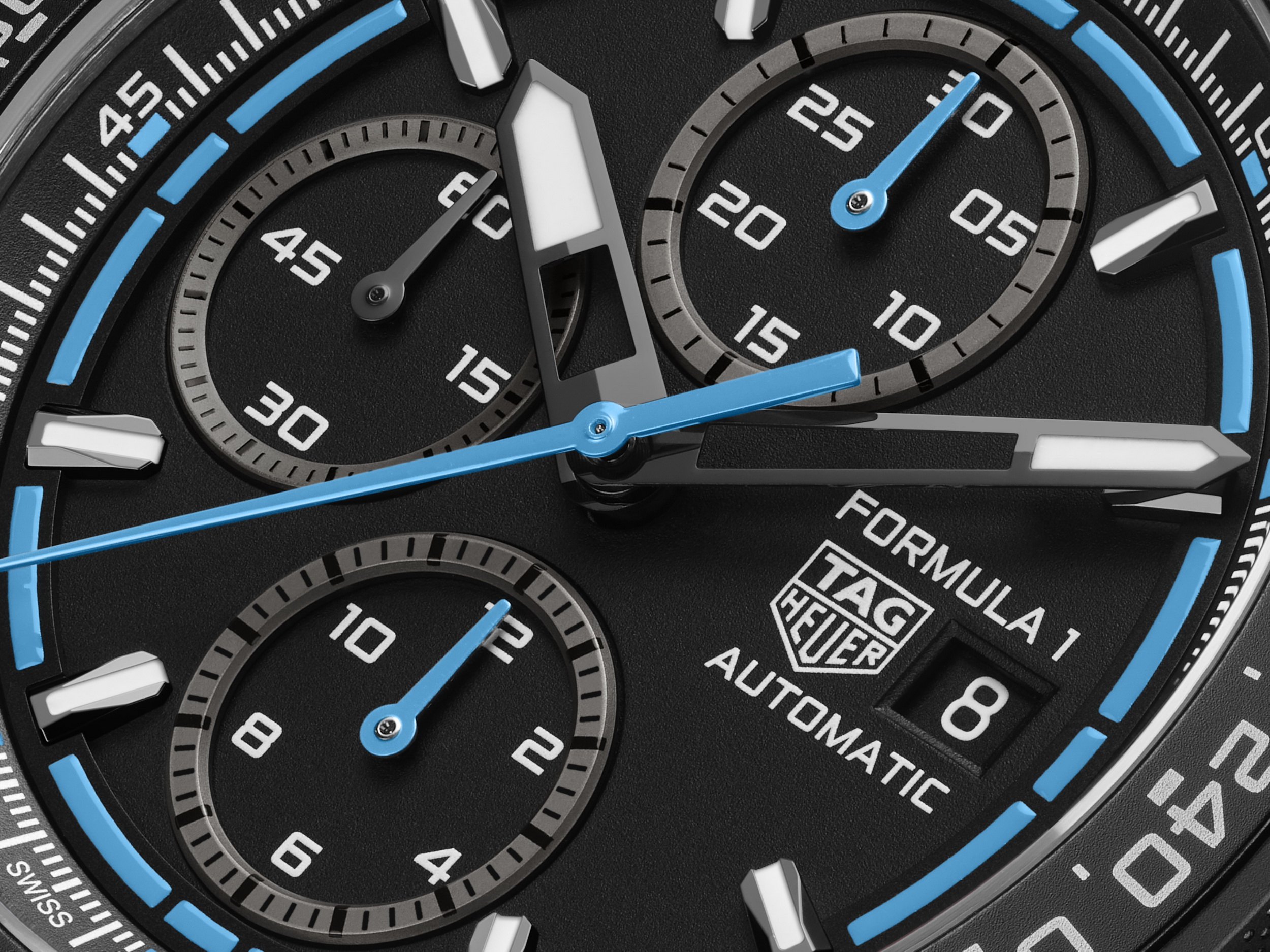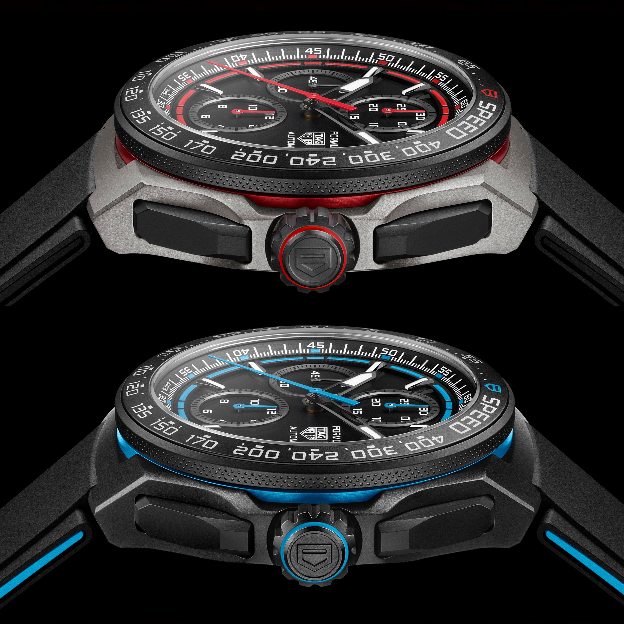 Here are descriptions of the two new Formula 1 chronographs that will be available in the Spring of 2024, with the “Blue” track model coming in March 2025 and the “Lime” track model coming in June 2025.