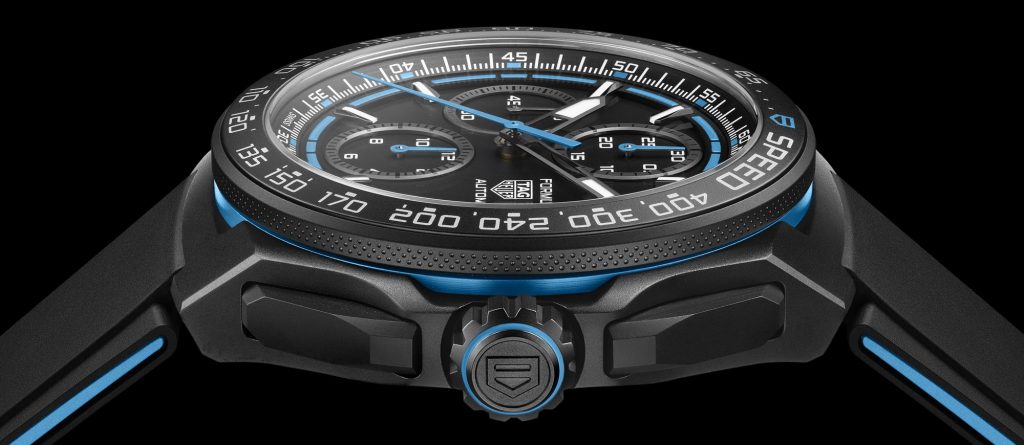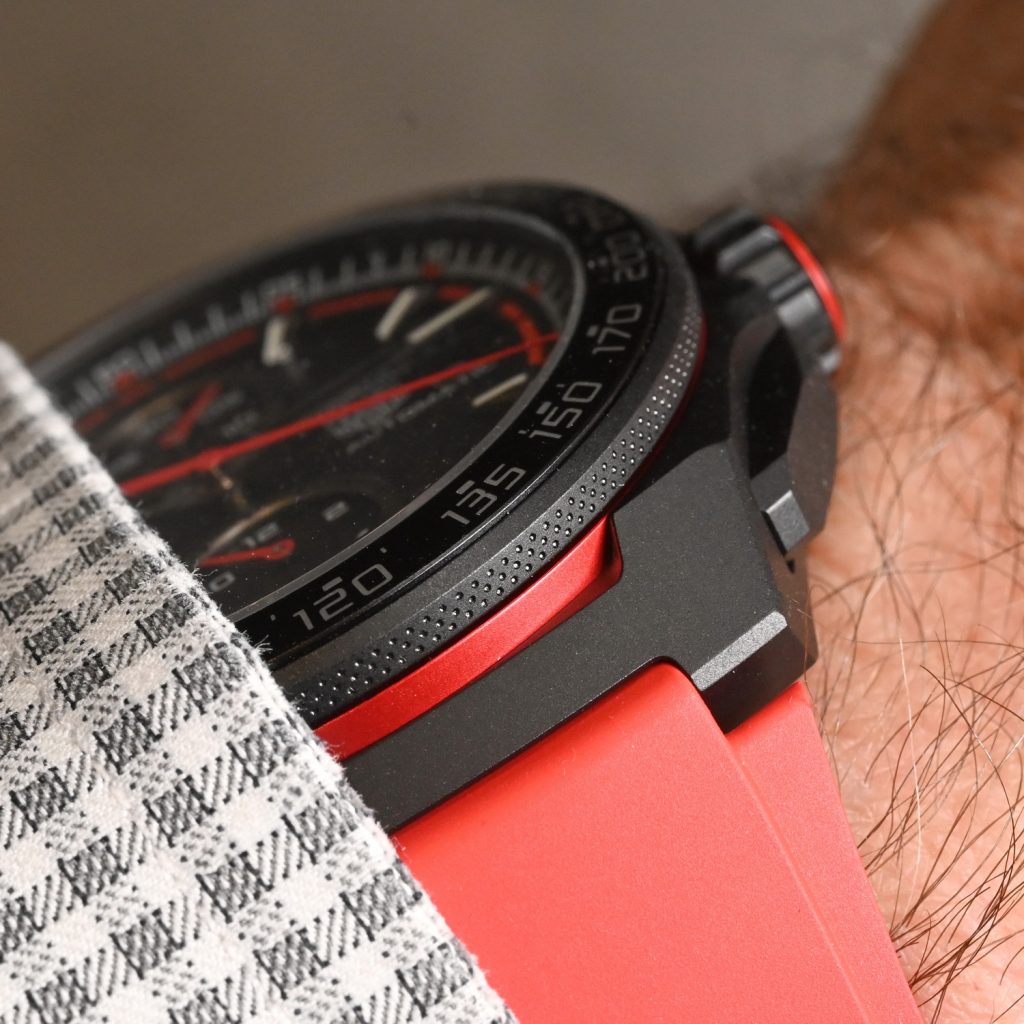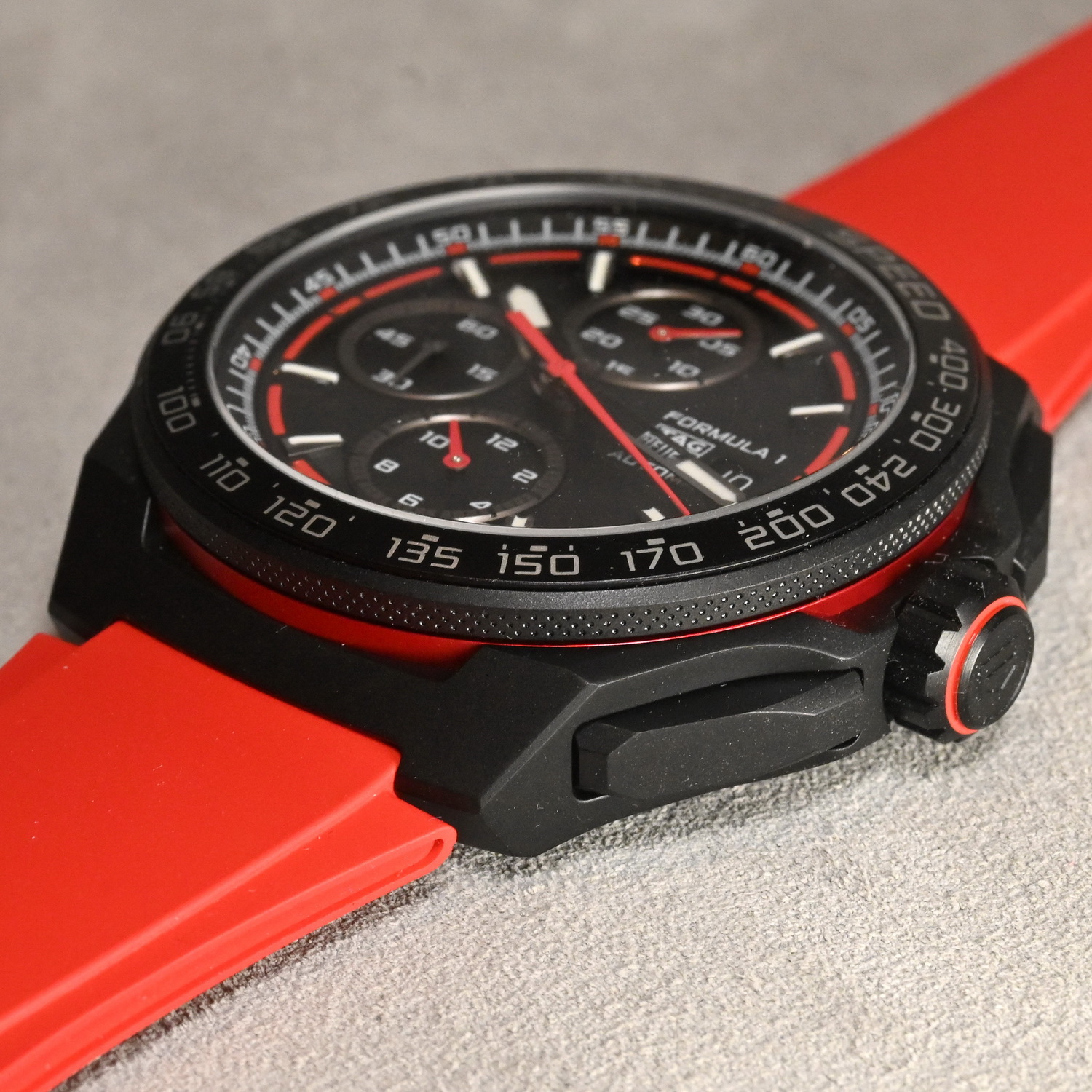 Today’s Materials and Technology — Beyond its design, the new generation of Formula 1 chronographs make good use of advances in watchmaking materials and technology. Titanium, with state-of-the-art DLC coating or a sandblasted finish, has replaced the stainless steel or composite used to make earlier models. Bezels have gone from crude plastic to aluminum and forged carbon. The Calibre 16 movement is tried and true, a completely different machine than the crude quartz movement that powered the first Formula 1 chronographs in the late 1980s.