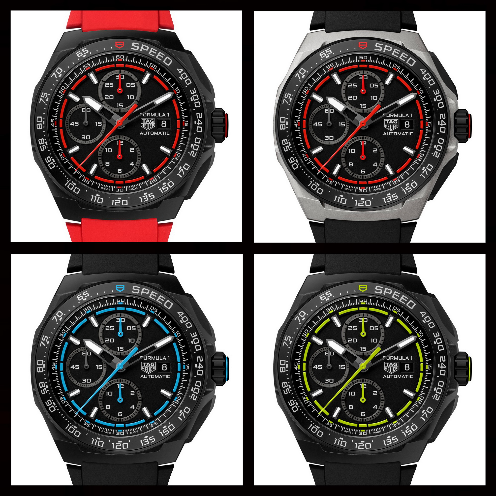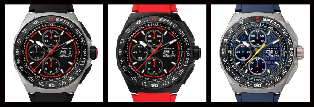 Here are descriptions of the three new Formula 1 chronographs that will be available immediately. They are shown left-to-right in the image shown above: