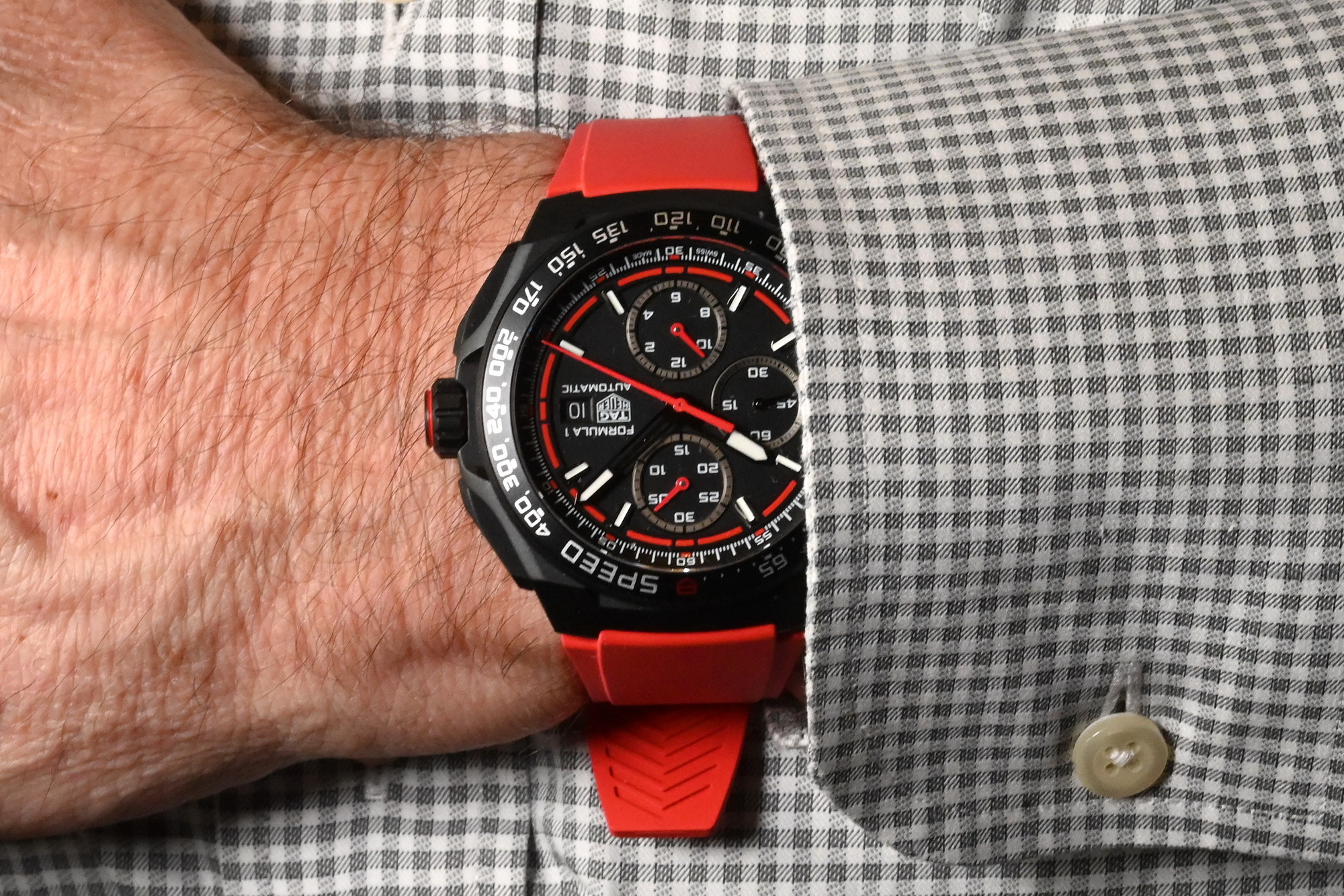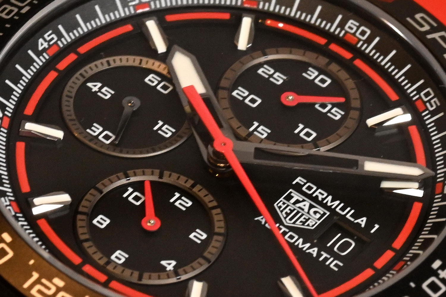 While no 44 millimeter chronograph is likely to win the annual prize for being my most worn watch, the new TAG Heuer Formula 1 Chronograph could easily take a spot on my “grab and go” shelf, alongside the Fragment Formula 1. It handles well, feels great on the wrist and just as the vintage Autavias, Carreras and Monacos connect today’s collectors to the racing of the 1960s and 70s, the new Formula 1 Chronograph captures the style of the modern racecars that we find on today’s Formula 1 grids.
