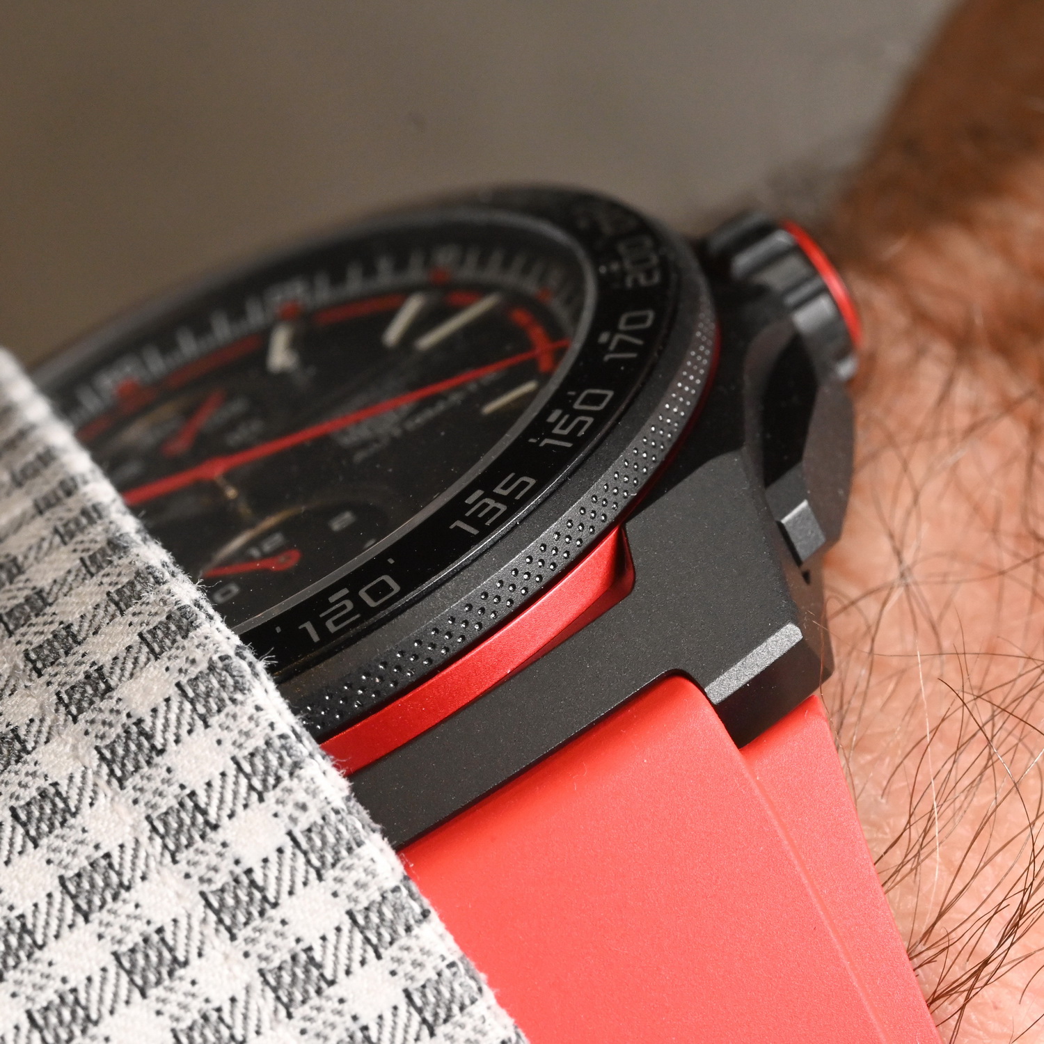 On the rubber strap, the new Formula 1 Chronograph weighs in at 111 grams versus 179 grams for the Fragment Design model on its stainless steel bracelet, so the new model feels entirely different on the wrist. It’s far lighter but also feels more balanced than the Fragment Design model, which tends to feel top heavy.