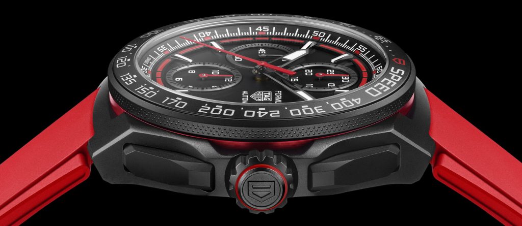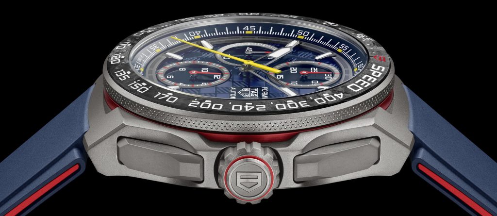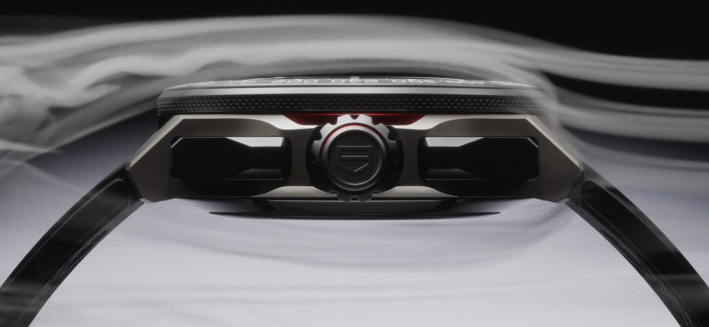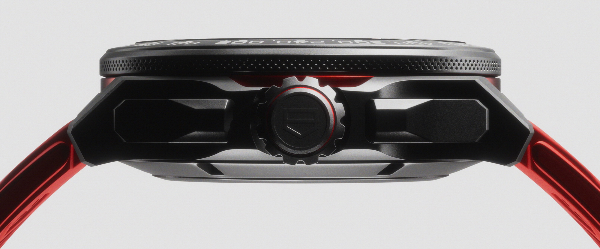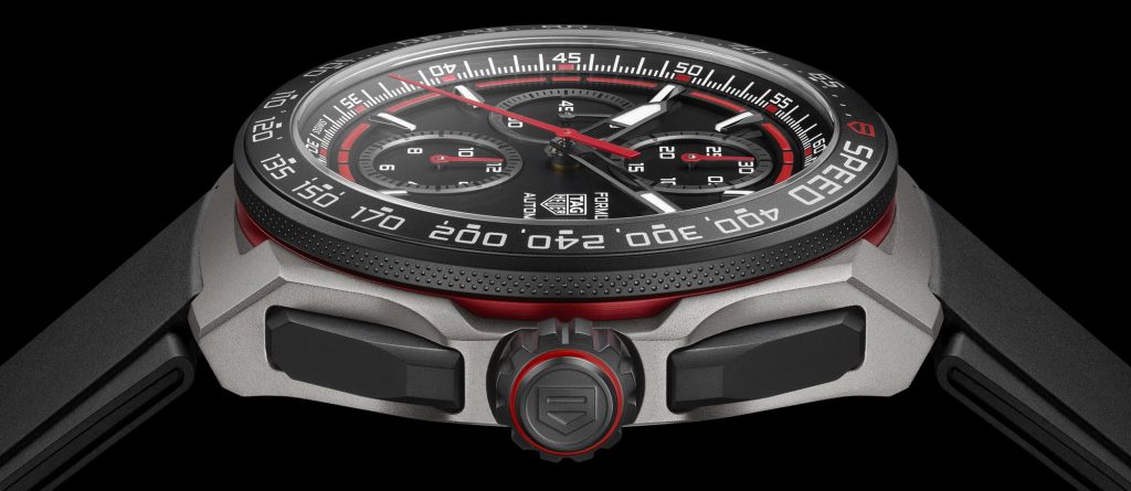 The Case and Bezel — TAG Heuer’s 2025 Formula 1 chronographs use an entirely new style of case, made of titanium and measuring 44 millimeters across the dial. Just as the cases of the original Formula 1 watches and chronographs evoked the style of Formula 1 cars of the mid-1980s, the new case incorporates design elements of a modern-day Formula 1 racecar. The shapes of these cars – wings, nose, sides, etc. – are informed primarily by aerodynamics (and rules imposed by Formula 1), and the curves and sculpture of the new Formula 1 chronographs remind the racing enthusiast of these shapes.