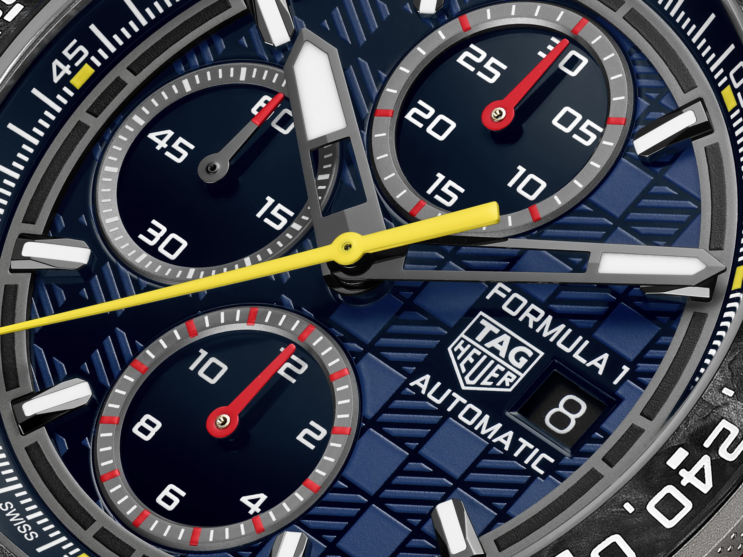 Beyond the shapes incorporated into the case, certain elements of the new chronograph are more explicit in taking their cues from specific parts of the Formula 1 racecar. Micro-perforations on the edge of the bezel capture the build of modern brake rotors; the indices applied to the dial are shaped like the nose of today’s racecars.
