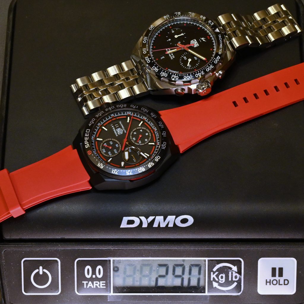 - Dimensions of the new Formula 1 chronograph are 44 millimeters across the dial, with a thickness of 14.1 millimeters and lug-to-lug length of 47.3 millimeters. On the strap, the chronographs weighs 111 grams.