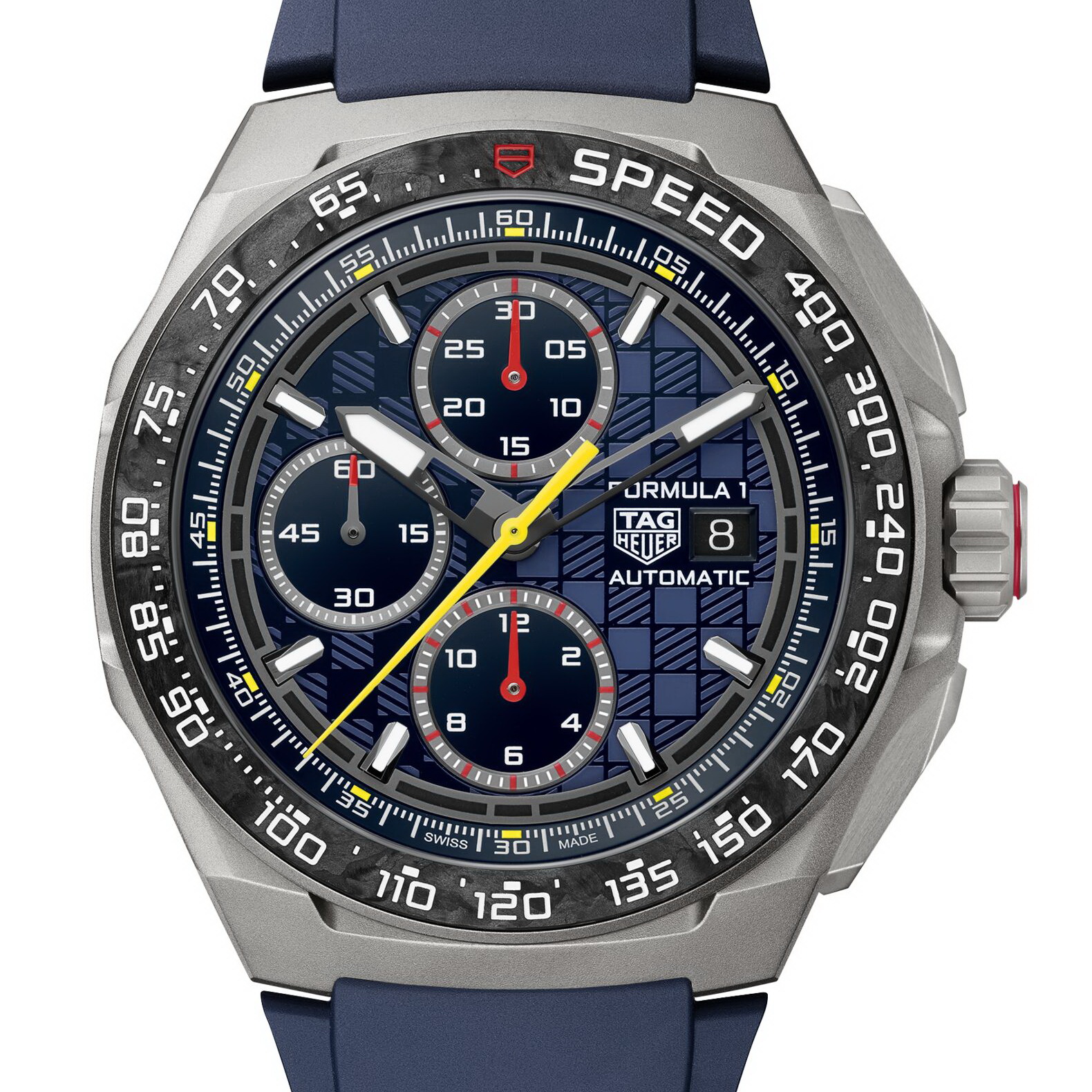 Oracle Red Bull Racing Special Edition in Sandblasted Titanium Case – Blue dial with checkered pattern and black lacquered track; sandblasted titanium case, forged carbon bezel; red ring between bezel and case; blue rubber strap with red rims. Available February 2025; priced at 5,300 CHF; reference CBZ2080.FT8091.
