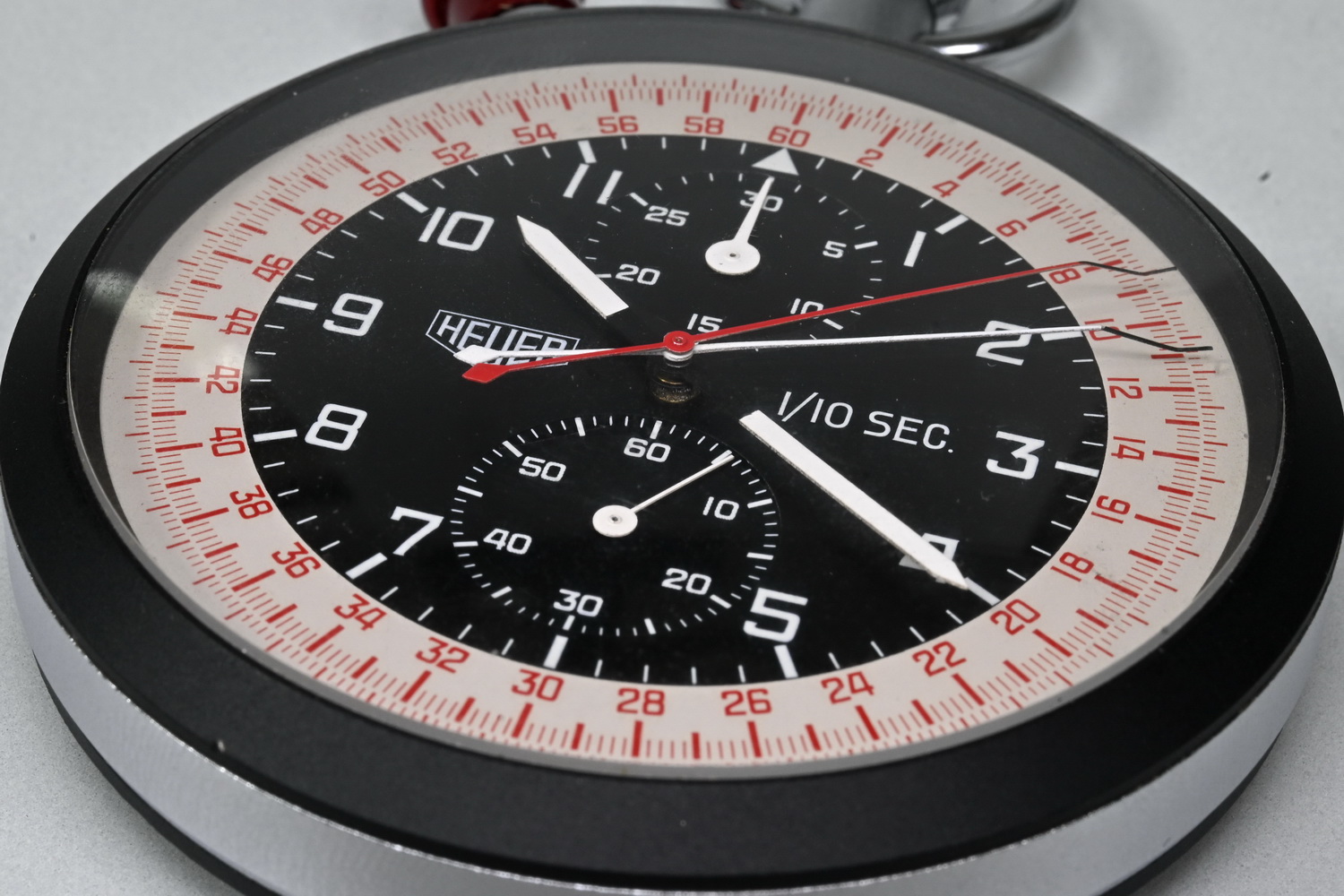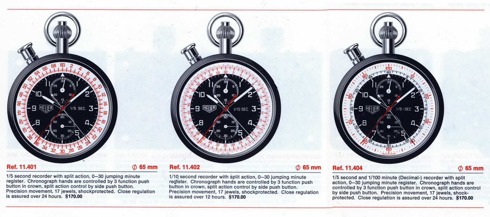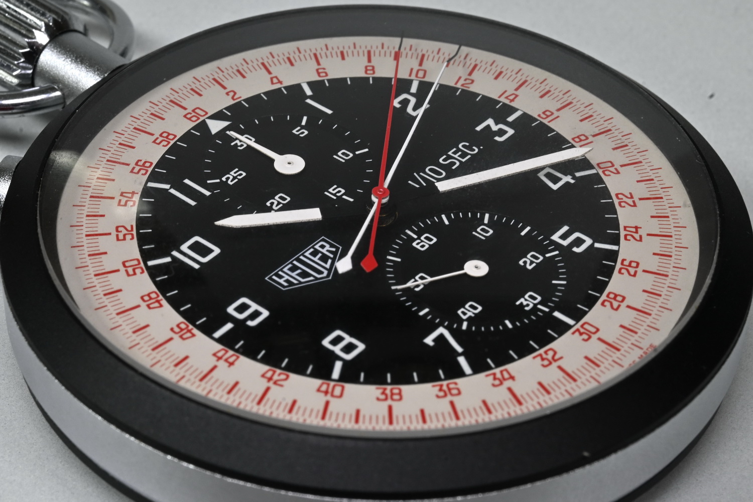 When introduced in 1968, the Reference 11.402 split-second pocket chronograph took its place as the “ultimate” Heuer stopwatch. Yes, the rattrapante mechanism is the “queen of complications” for chronographs, and with its 65 millimeter case, black dial and top bezel, bright white hands, and red and off-white outer scale, the Reference 11.40x series represents the “ultimate” stopwatch. Add the 1/10 indication for the Reference 11.402, and a company that had been making stopwatches for over 100 years had produce its most technically-complicated stopwatch. Many enthusiasts would also suggest that this was one of Heuer’s best pieces of design work, combining dramatic bright colors to create a useful, legible instrument.