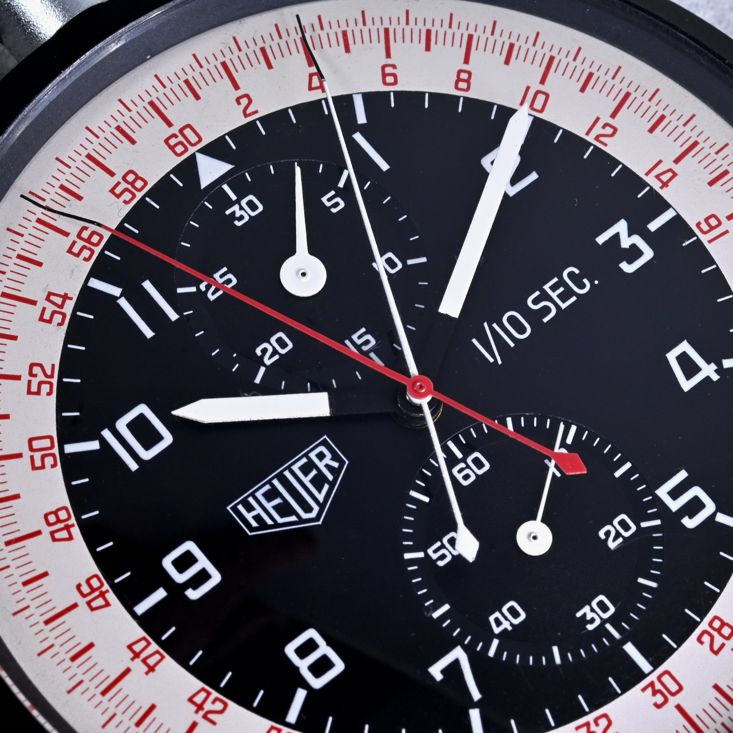 With the larger 65 millimeter case, Heuer had some extra real estate available on the dial, and much of it was used on the wide outer track that is marked for seconds / decimal minutes, with red printing on an off-white background. The chronograph second hands are elongated to reach this track, and the distal ends bend down toward the dial, allowing more precise readings of the 1/5 or 1/10 seconds.
