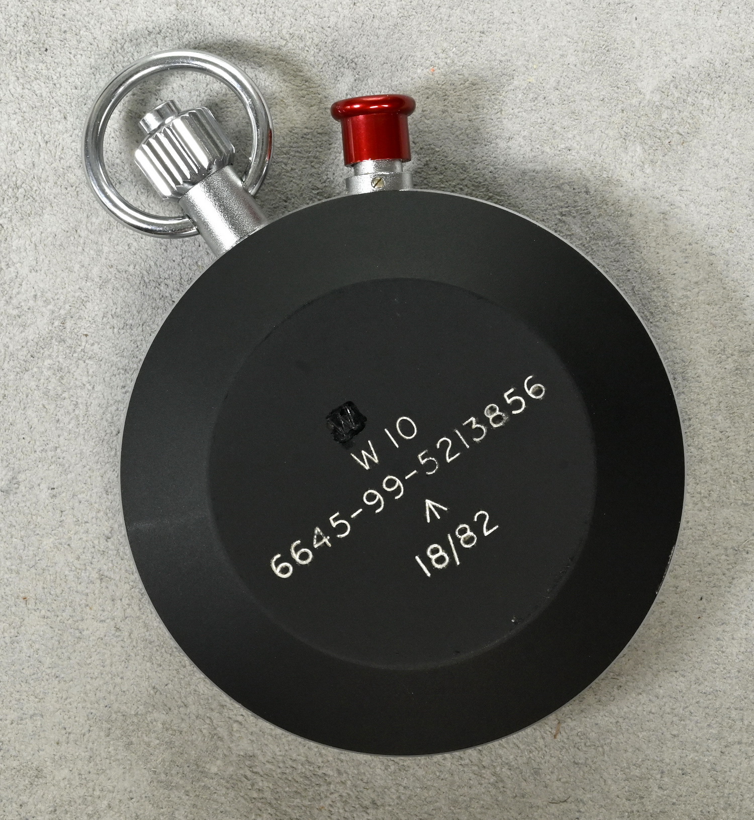 The construction of the three-piece case was similar to that employed for most of the “Century” stopwatches, which Heuer called a “sandwich case” — black anodized front bezel, nickel chrome-plated mid-case, and black-anodized case-back.