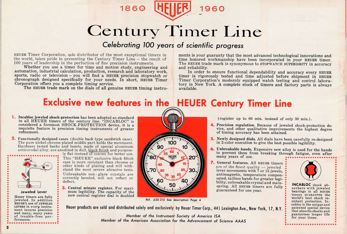 Still, the main change in the new “Century” line of stopwatches came with the dials and hands. On the new models, the dials were bright white, the outer scale typically showed seconds or decimal minutes in large black Arabic numerals, and minutes moved to a central register, printed in bright red. The hands matched the scales, black for the outer scale and red for the inner scale. With the larger central minutes register, capacity of standard stopwatches increased from 30 minutes to 60 minutes, and Heuer advertised that the new “Century” design guaranteed 85% greater legibility.