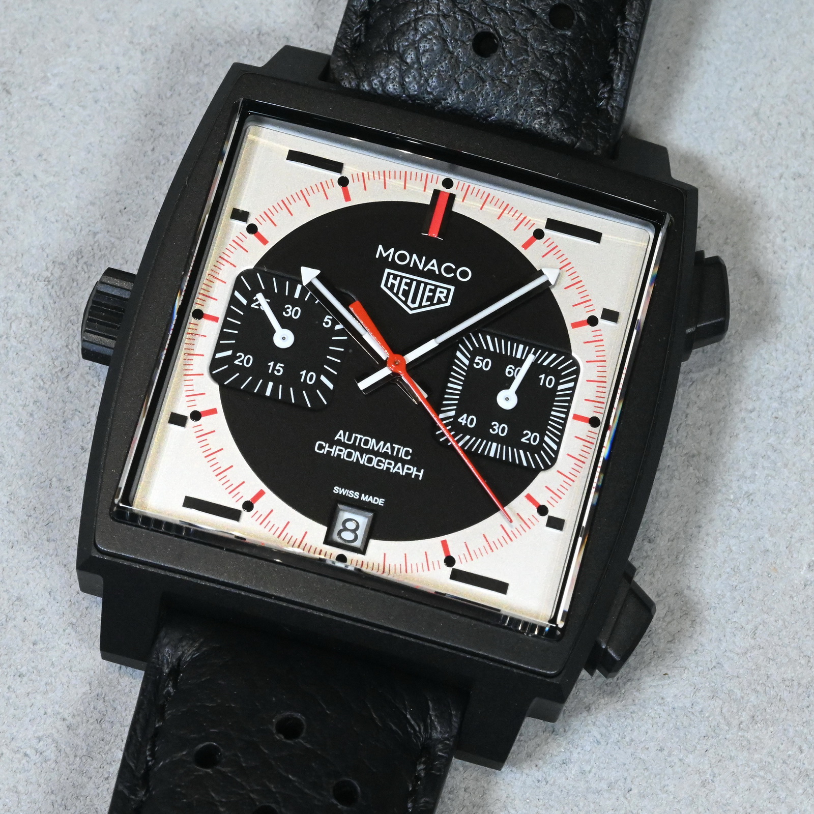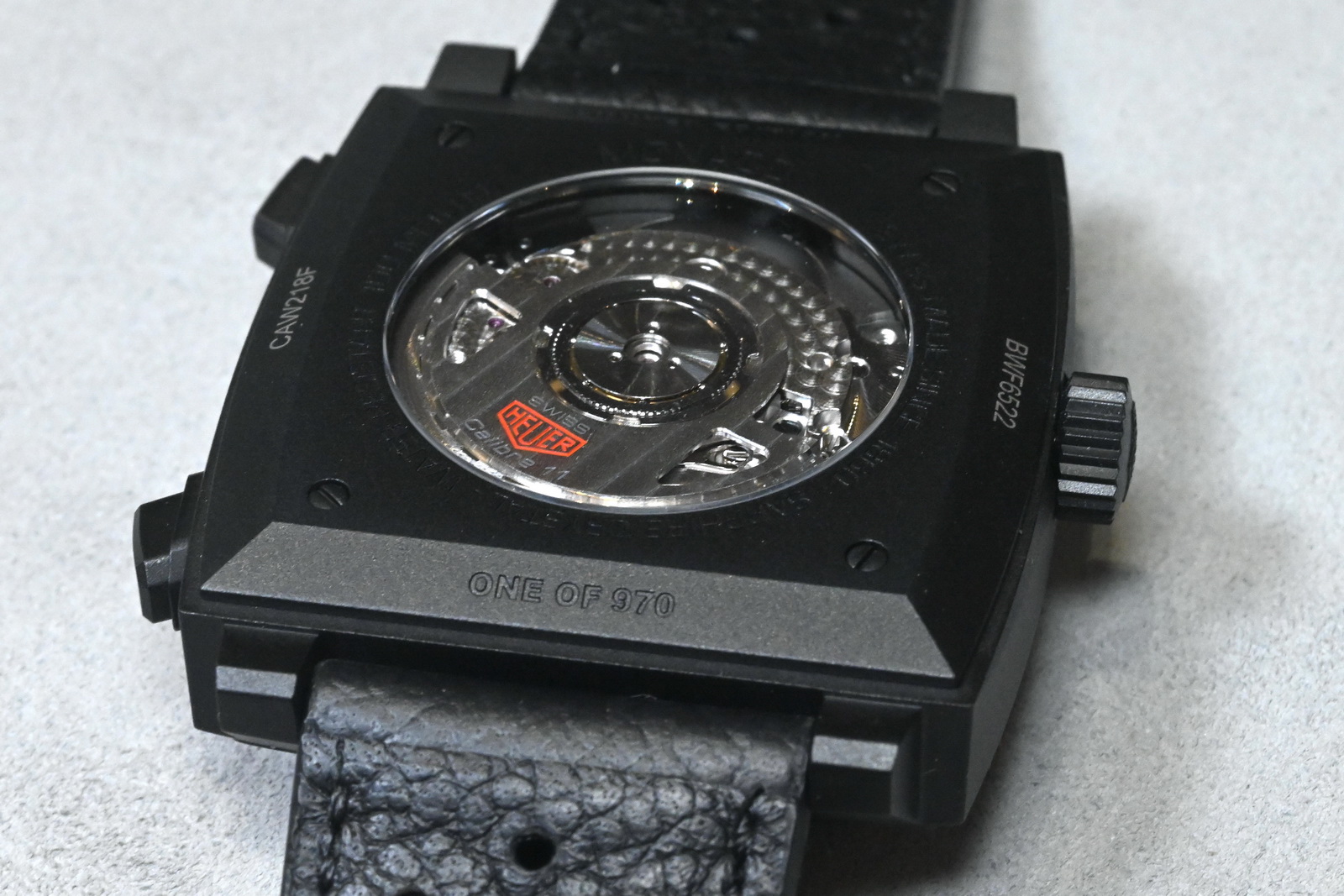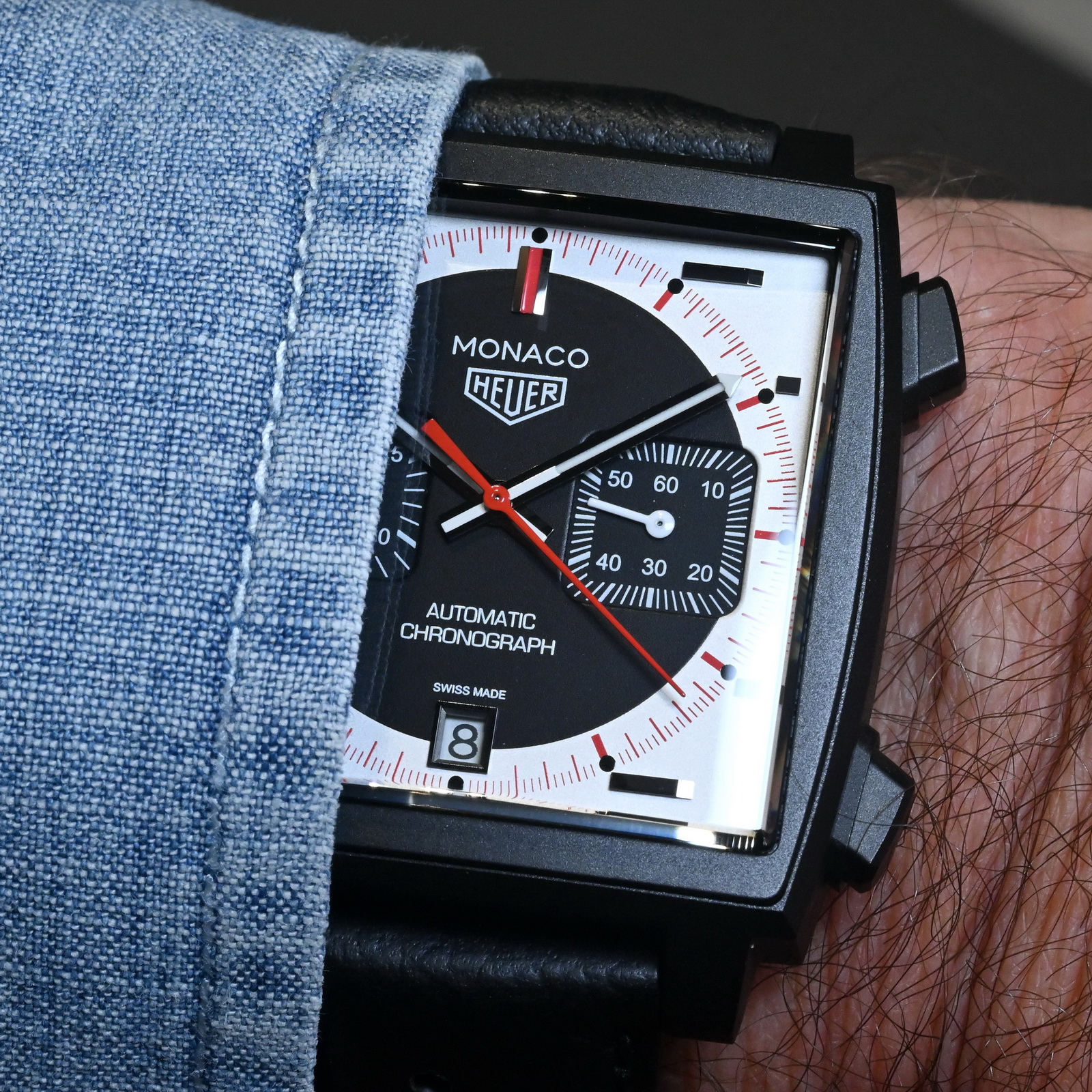 The original “Century” stopwatches from the 1960s used then-state-of-the-art materials for cases, and the new Monaco Chronograph Stopwatch LE follows suit, with sandblasted black DLC grade-2 titanium, with this same material used for the crown and pushers.