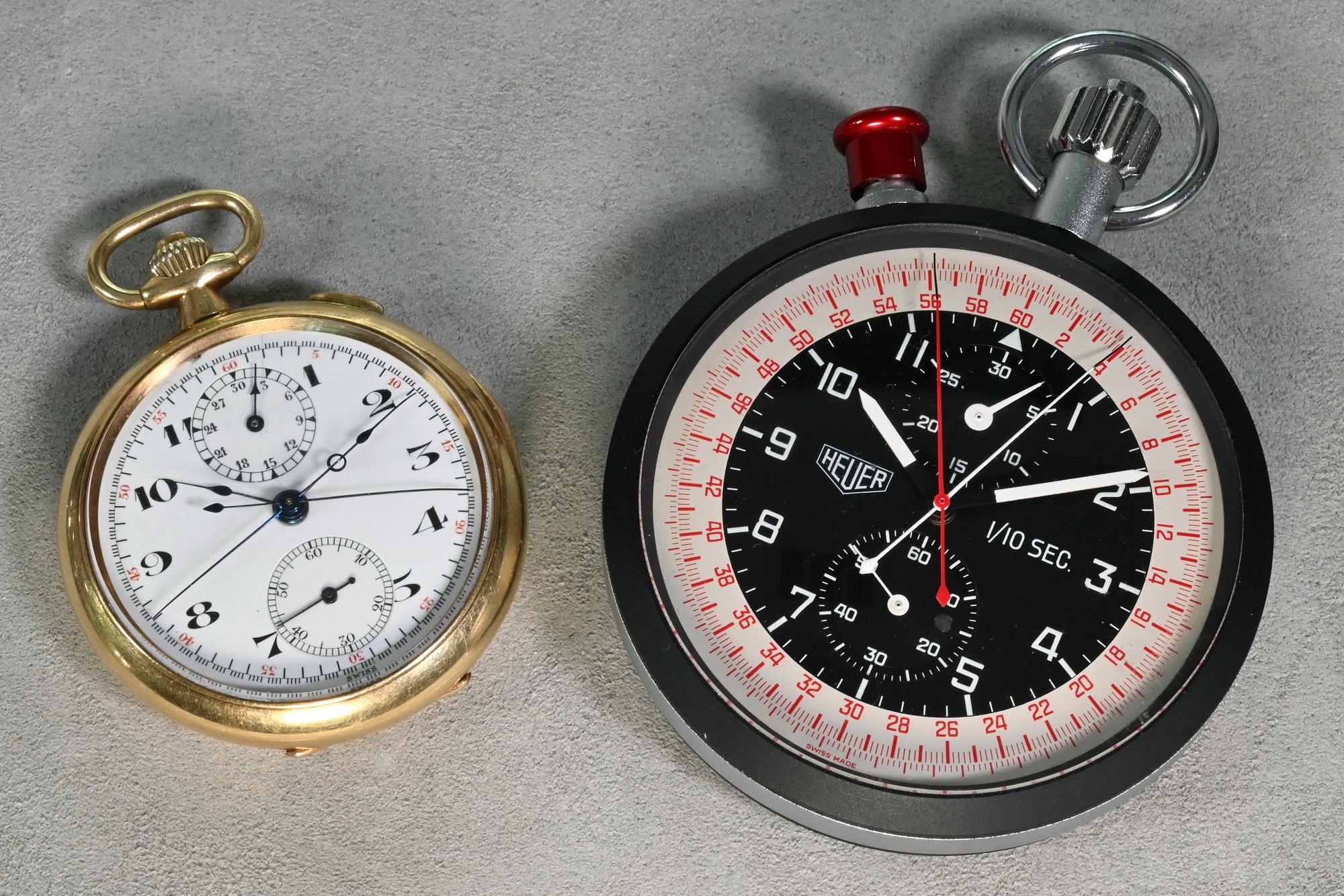 I have always been a fan of Heuer’s 1960s-style stopwatches and I have recently become a big fan of the rattrapante pocket chronographs that Heuer produced over the period from 1900 through the early 1970s. The success of these timepieces was an important part of Heuer gaining a dominant position in motorsports timing in the “golden age” of motorsports. Beyond their history, these stopwatches and rattrapante pocket chronographs were and continue to be beautiful objects.