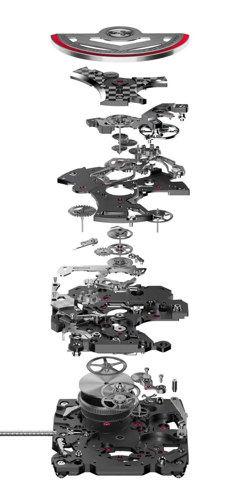 - On Black DLC model, arches are black DLC; registers are black opalin; hands on chronograph recorders and split-second hand are red lacquered