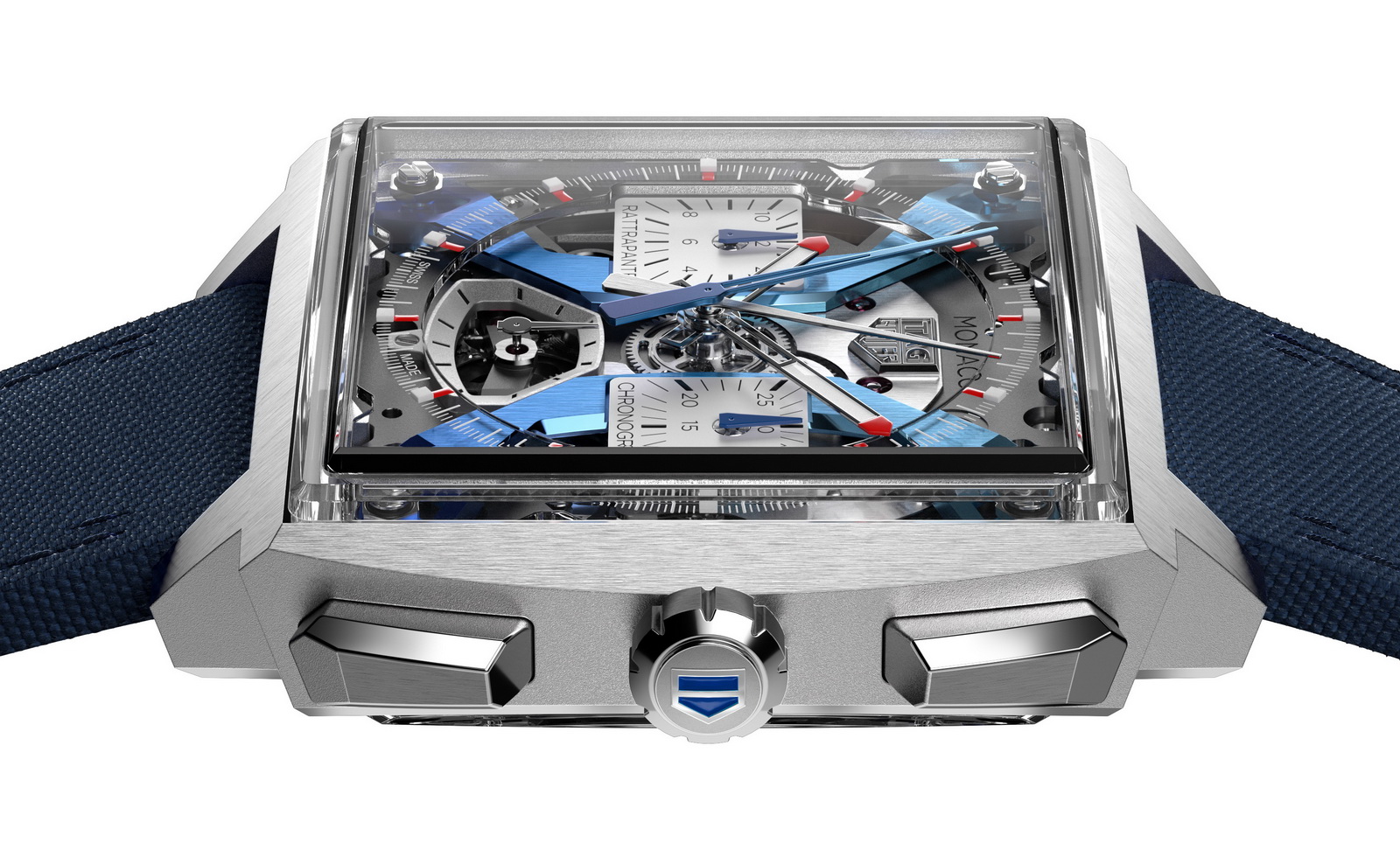 Compared with any other watch previously produced by TAG Heuer, the new Monaco Split-Seconds Chronograph makes the boldest use of sapphire. We are accustomed to seeing sapphire used for two crystals – the front crystal that covers the dial and hands and the crystal incorporated into the case-back to create a “display back”. On the newest Monaco, the dial itself is made of sapphire and the entire case-back is a piece of sapphire.