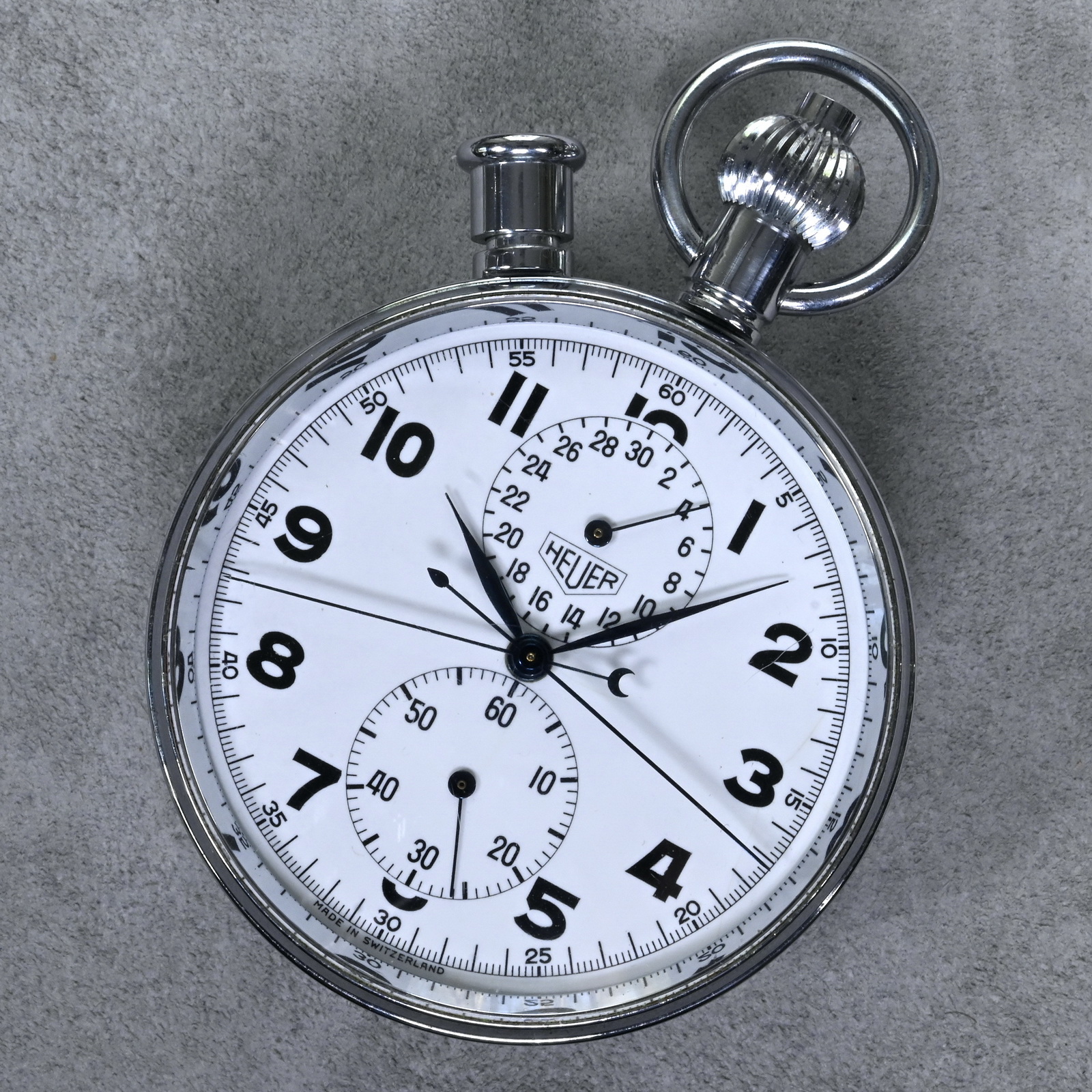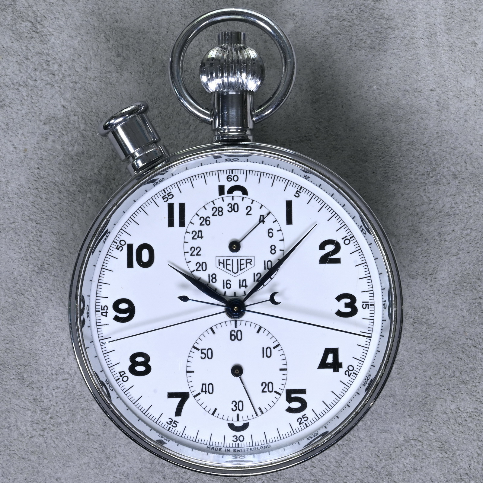 The split-second chronograph complication is considered one of the three highest achievements among “complicated” watches, with the other two being the perpetual calendar and the minute repeater. Over the period from approximately 1890 through 1975, Heuer offered a range of split-second pocket chronographs, all of them powered by mechanical movements. These timepieces were the most complicated timepieces in the Heuer catalog, and also the most expensive.