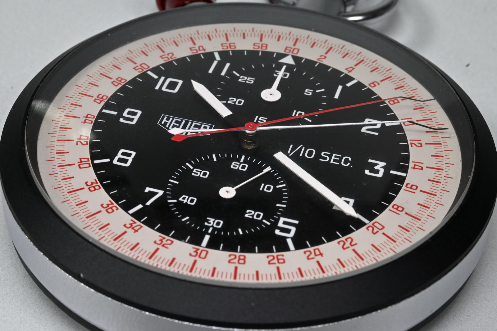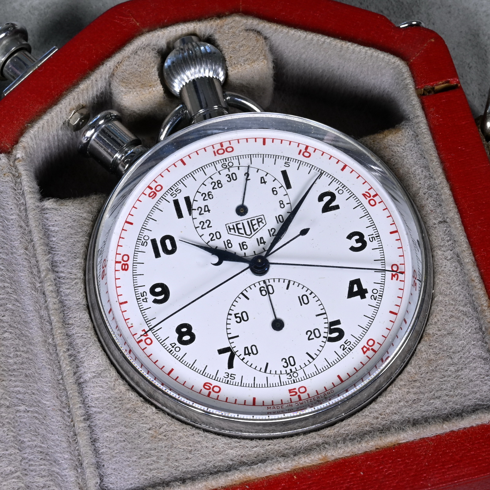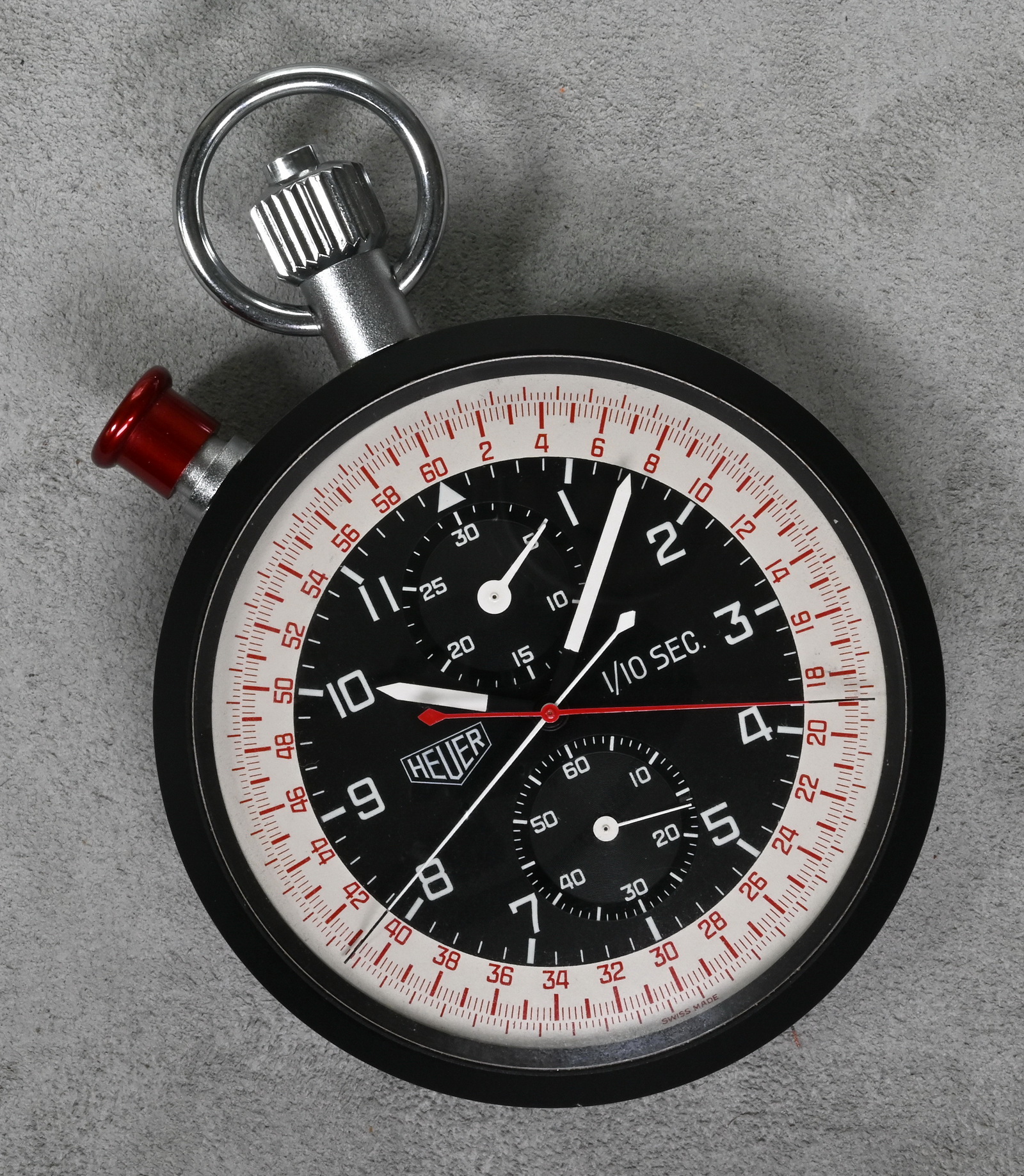 We look at Heuer’s catalogs over the decades, and wonder why the company never made a split second chronograph for the wrist. Nick Biebuyck, Heritage Director at TAG Heuer, offers this response, “Heuer always sought to produce the most functional types of timepieces and the type of precision timekeeping that was required for racing, rallying and other sports required the larger dial of a pocket chronograph, rather than the smaller dial of a wristwatch. When you compare the “display” that is possible with a 36 or even 40 millimeter wristwatch to what you get with a 52, 57 or even 65 millimeter pocket timer, there is an enormous difference. For reading 1/5 or 1/10s of seconds, or even full seconds, you need the larger display of the pocket timepiece.”