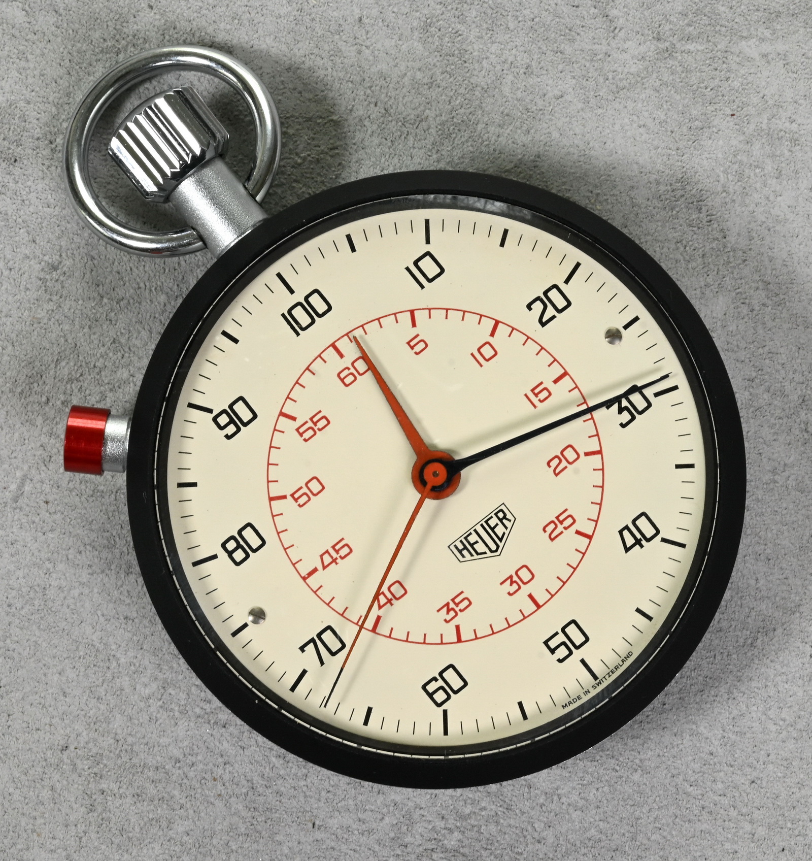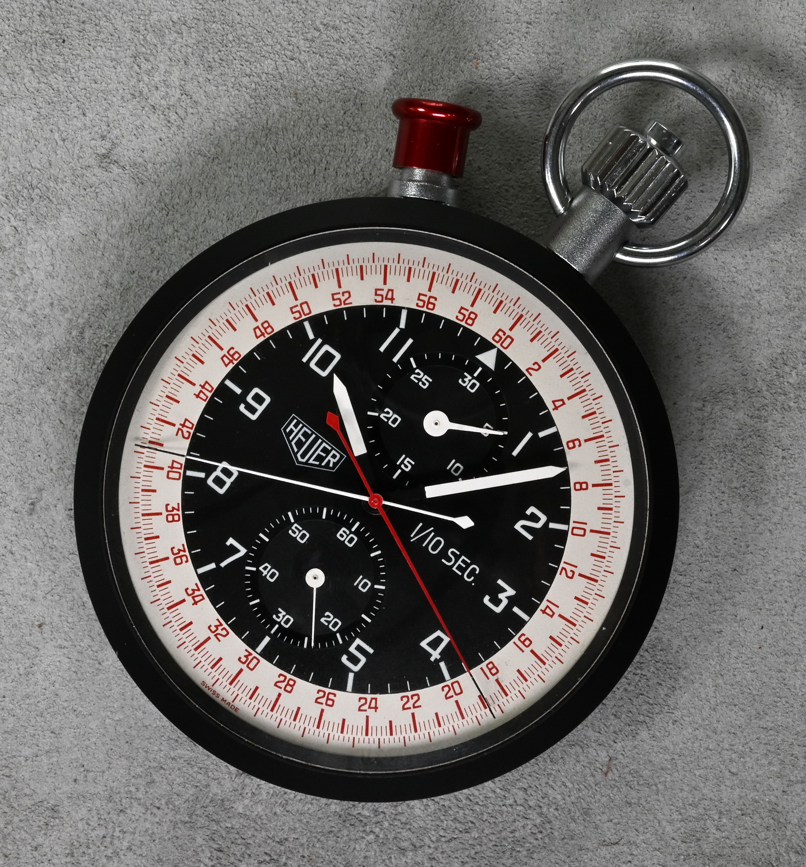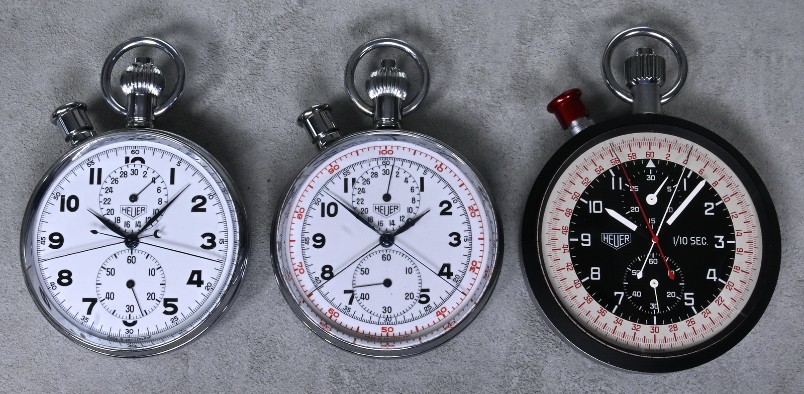 We look at Heuer’s catalogs over the decades, and wonder why the company never made a split second chronograph for the wrist. Nick Biebuyck, Heritage Director at TAG Heuer, offers this response, “Heuer always sought to produce the most functional types of timepieces and the type of precision timekeeping that was required for racing, rallying and other sports required the larger dial of a pocket chronograph, rather than the smaller dial of a wristwatch. When you compare the “display” that is possible with a 36 or even 40 millimeter wristwatch to what you get with a 52, 57 or even 65 millimeter pocket timer, there is an enormous difference. For reading 1/5 or 1/10s of seconds, or even full seconds, you need the larger display of the pocket timepiece.”