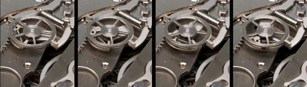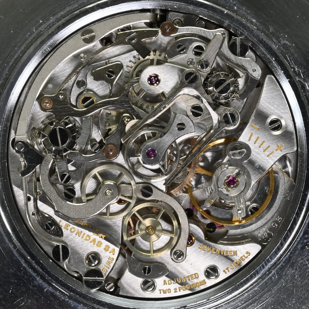 We can quickly identify a split-second timer by its large “pincers”, which are the brakes that stop and release the wheel that is attached to the split-second hand. A properly adjusted movement is able to stop the split-second hand in an instant, allow the primary second hand to continue running (with no interference from the stopped hand) and then reliably reunite the two hands, as they continue running together.