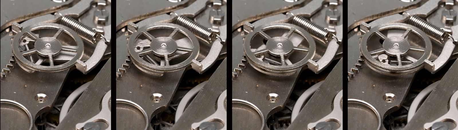The images above show that, with the “brake engaged”, the wheel that carries the split second hand is stopped, but the wheel that carries the primary second hand is continuing to rotate around the dial.
