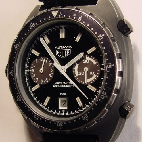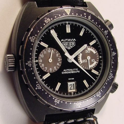 Fast-forward a decade to the years immediately following the First Lebanon War in 1982, and we come across yet another interesting chronograph: the Heuer Autavia ref. 113.603, a cushion-cased, 41mm, dual-register watch featuring an early black PVD coating. This time powered by the famed automatic Heuer cal. 12, this Autavia features a black dial with 30-minute totalizer at 3 o’clock, 12-hour totalizer at 9 o’clock, and a date window above the 6 o’clock position. Baton hands, tritium lume, and a matching black count-up bezel make for a highly stealthy, tactical-looking watch, the back of which features the “sterile” numbering system.