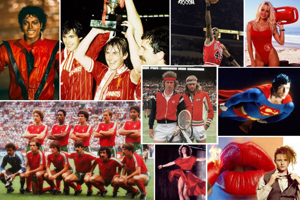 Update — Writing in Espiral do Tempo, on June 17, 2019, Miguel Seabra makes the case that the 1980s was, in fact, the decade of red.  Seabra considers imagery from the worlds of Formula One racing, other sports (tennis, basketball and soccer), music, automobiles and television to suggest that red was a dominant color in the 1980s.  Posted below are two collages that were included in the Espiral do Tempo posting.